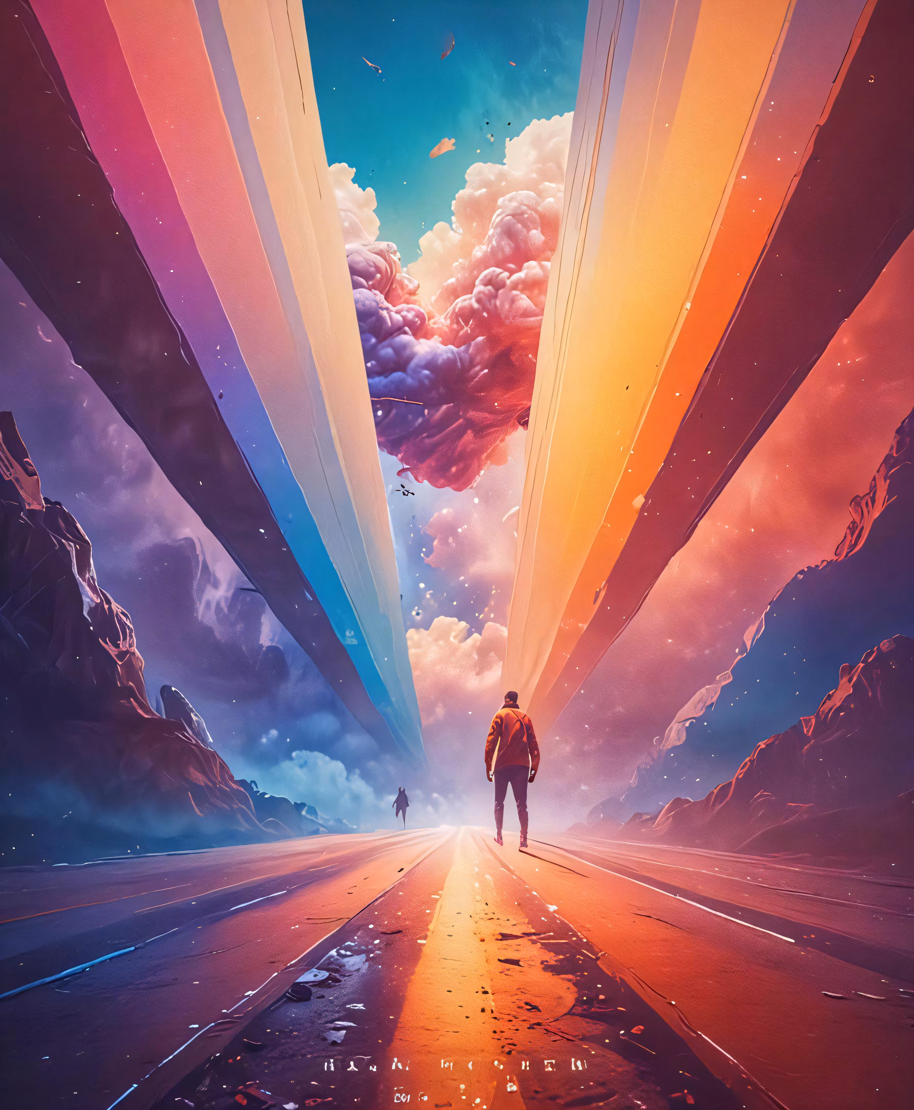 High resolution picture, free to use, a man is looking at a rainbow sky