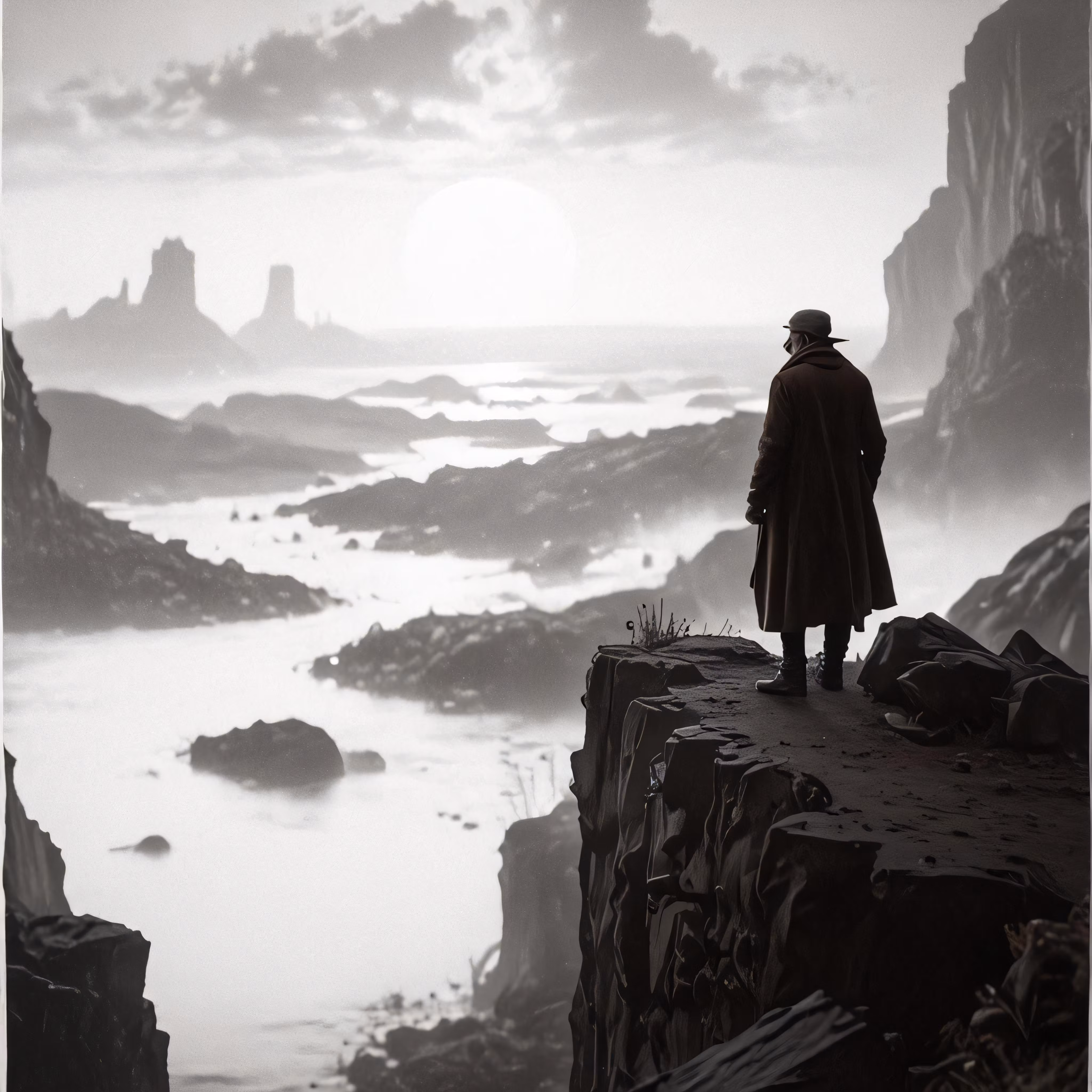 High resolution picture, free to use, a man is overlooking the water from his rocky cliff