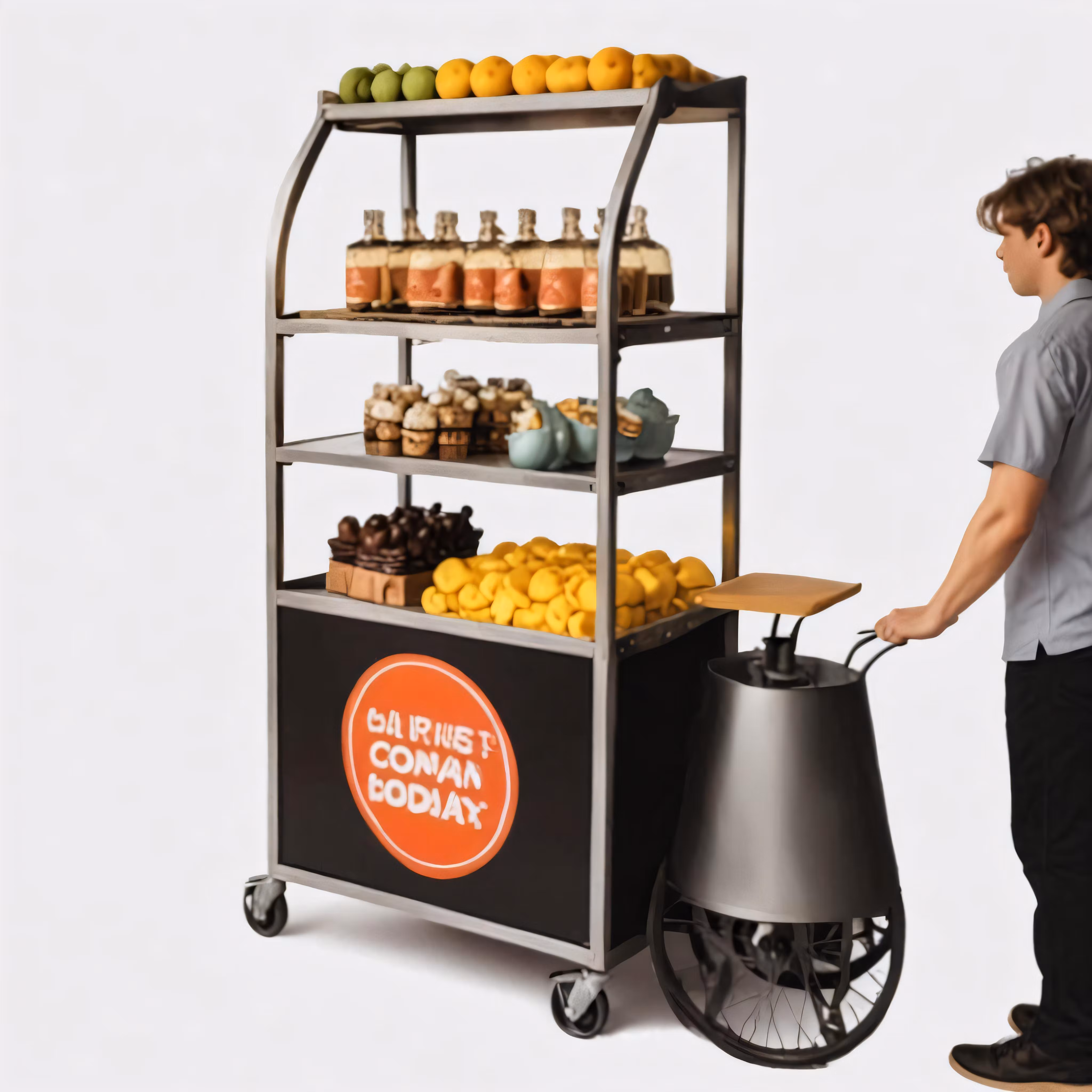 High resolution picture, free to use, a man is pushing a cart with fruit in it