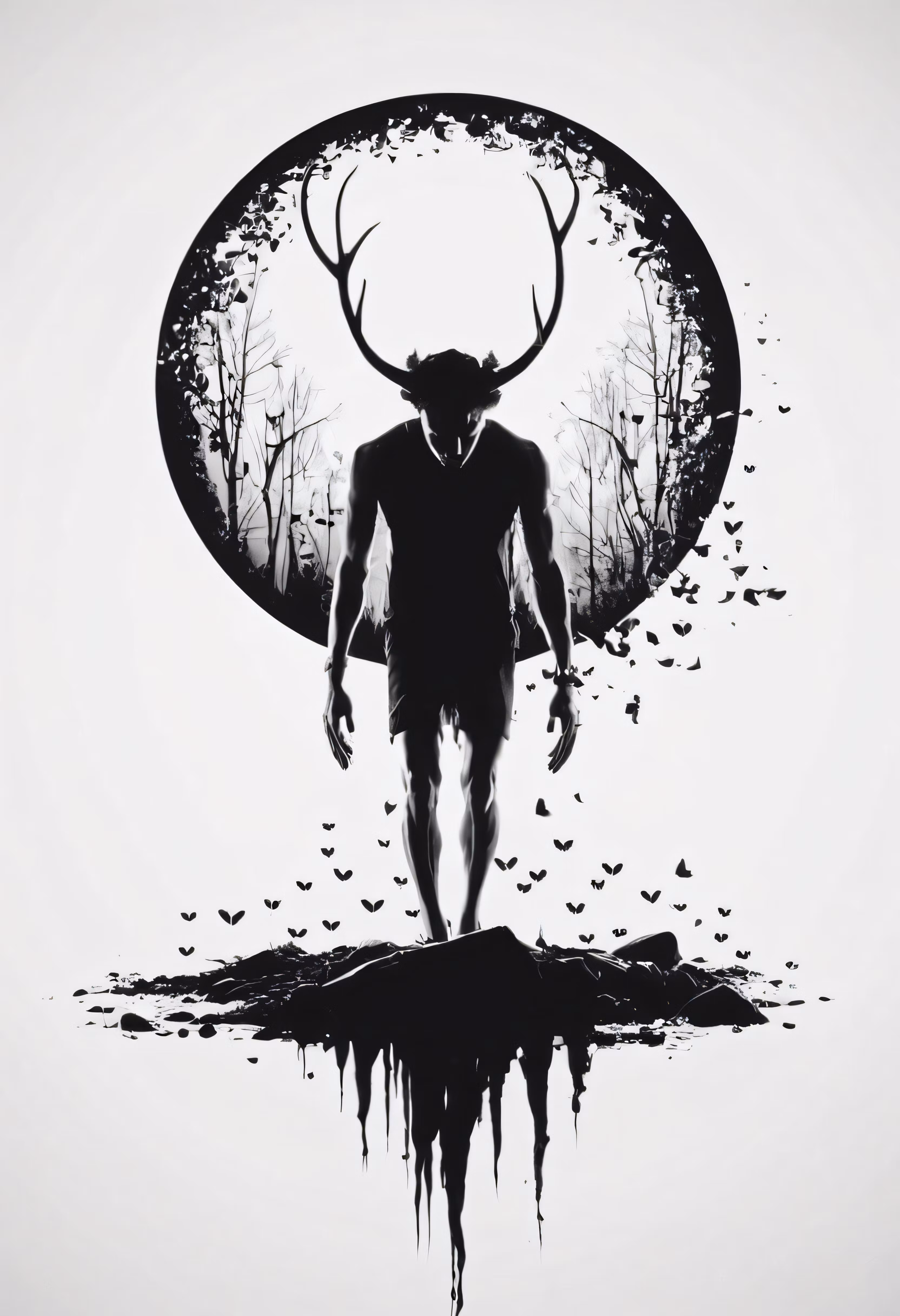 High resolution picture, free to use, a man is standing in front of an ink painting of a deer