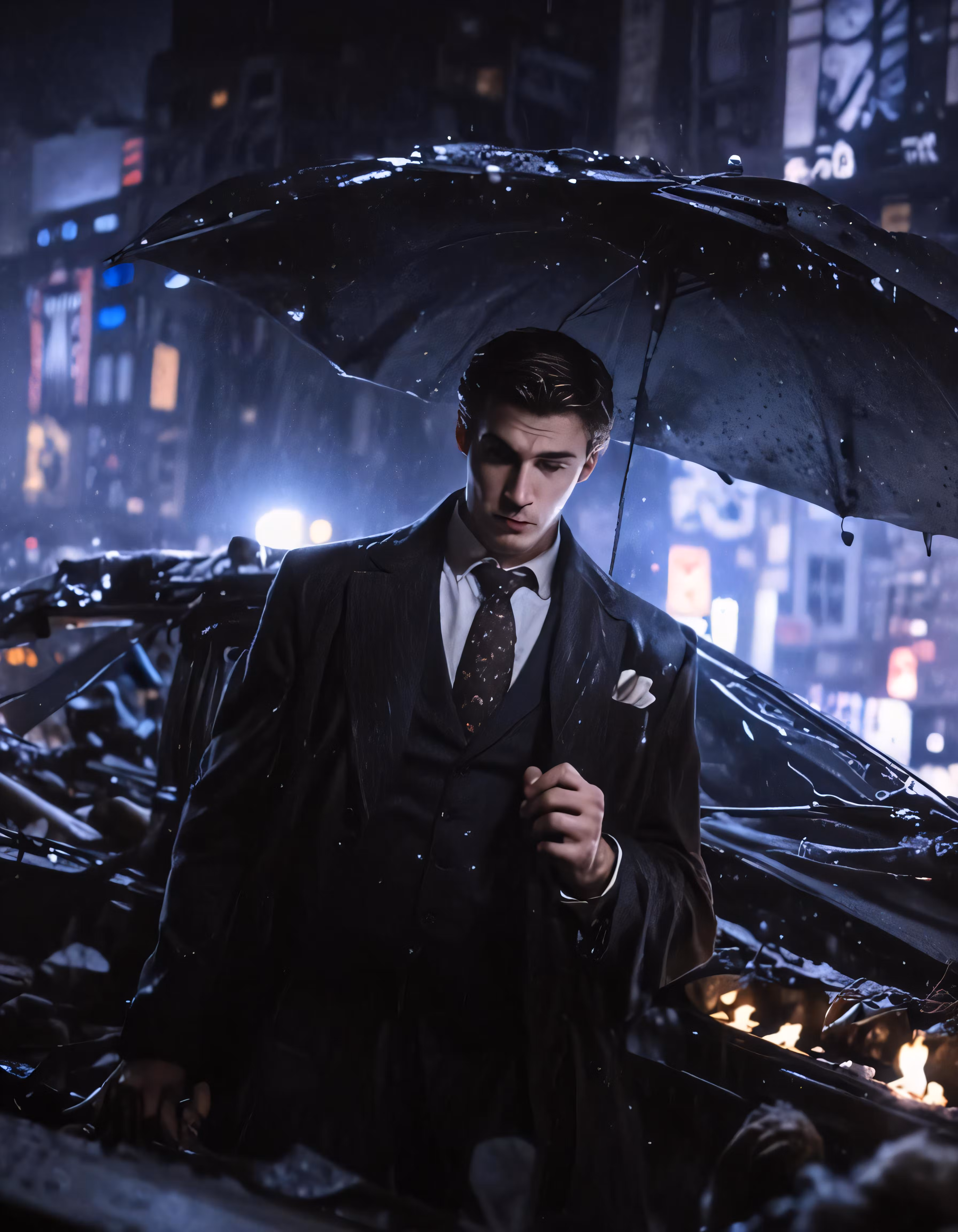 High resolution picture, free to use, a man is walking in the rain in his tuxedo and holding an umbrella