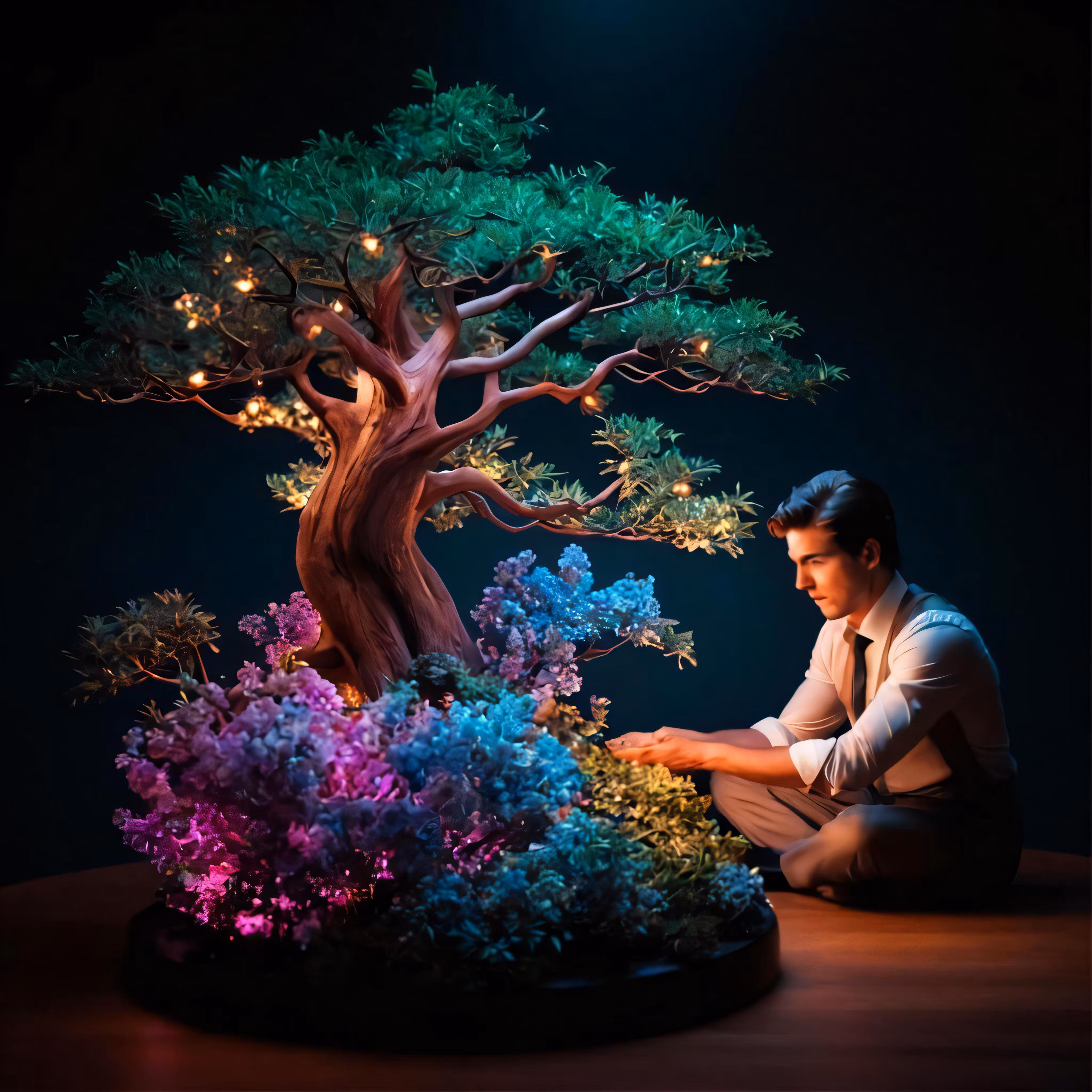 High resolution picture, free to use, a man is working on his laptop near some bonsai trees