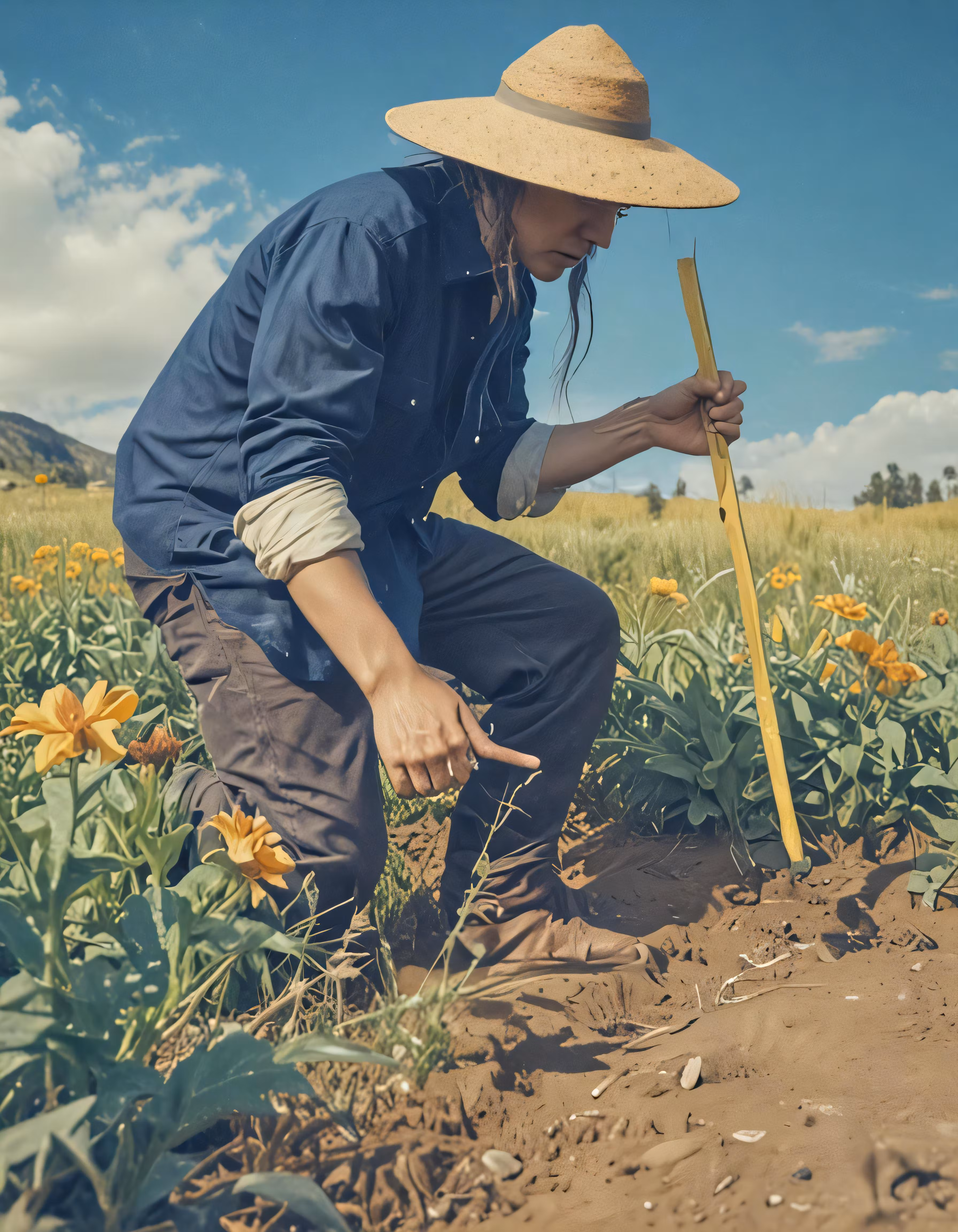 High resolution picture, free to use, a man kneeling down in a field working on plants