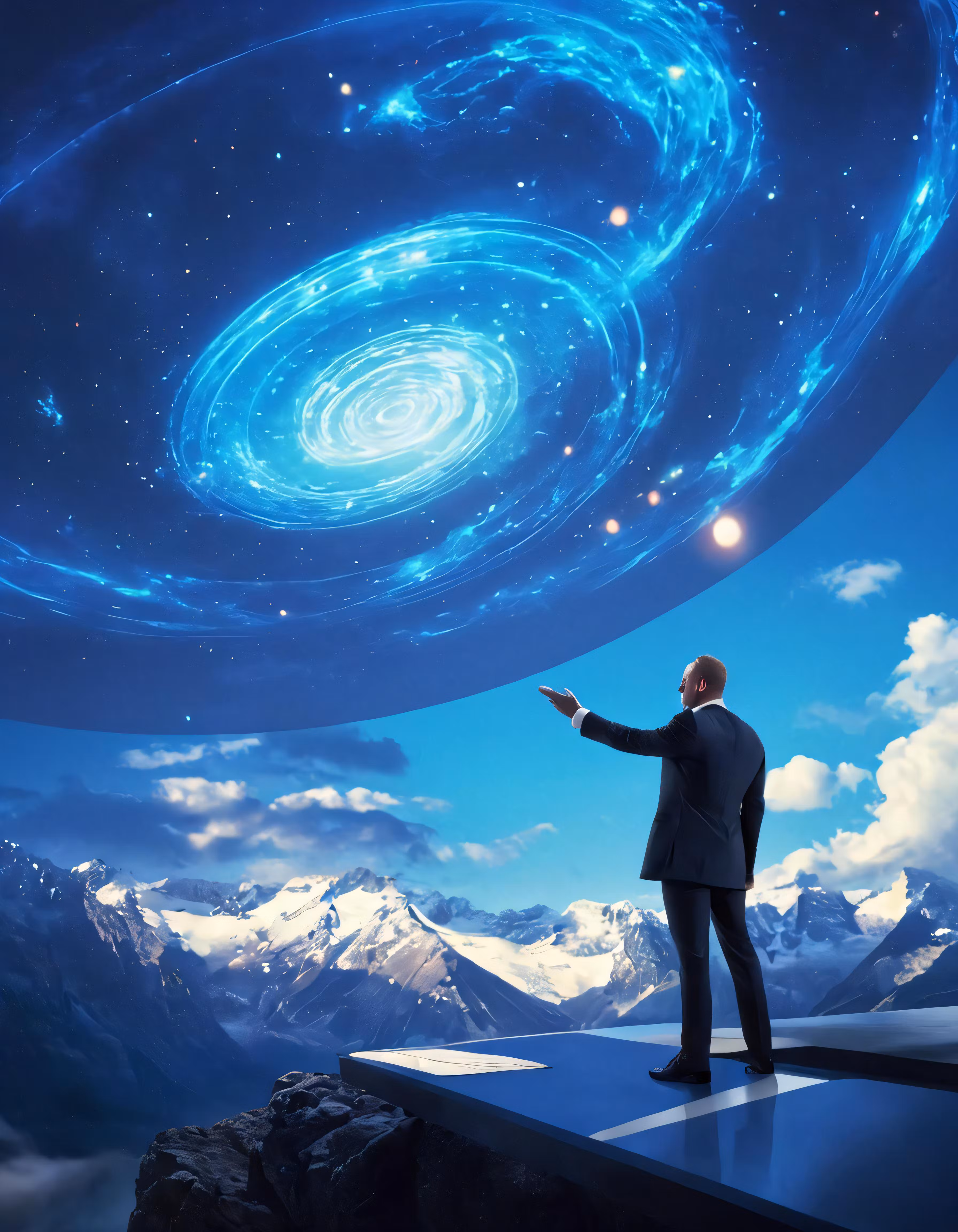 High resolution picture, free to use, a man pointing at a blue galaxy