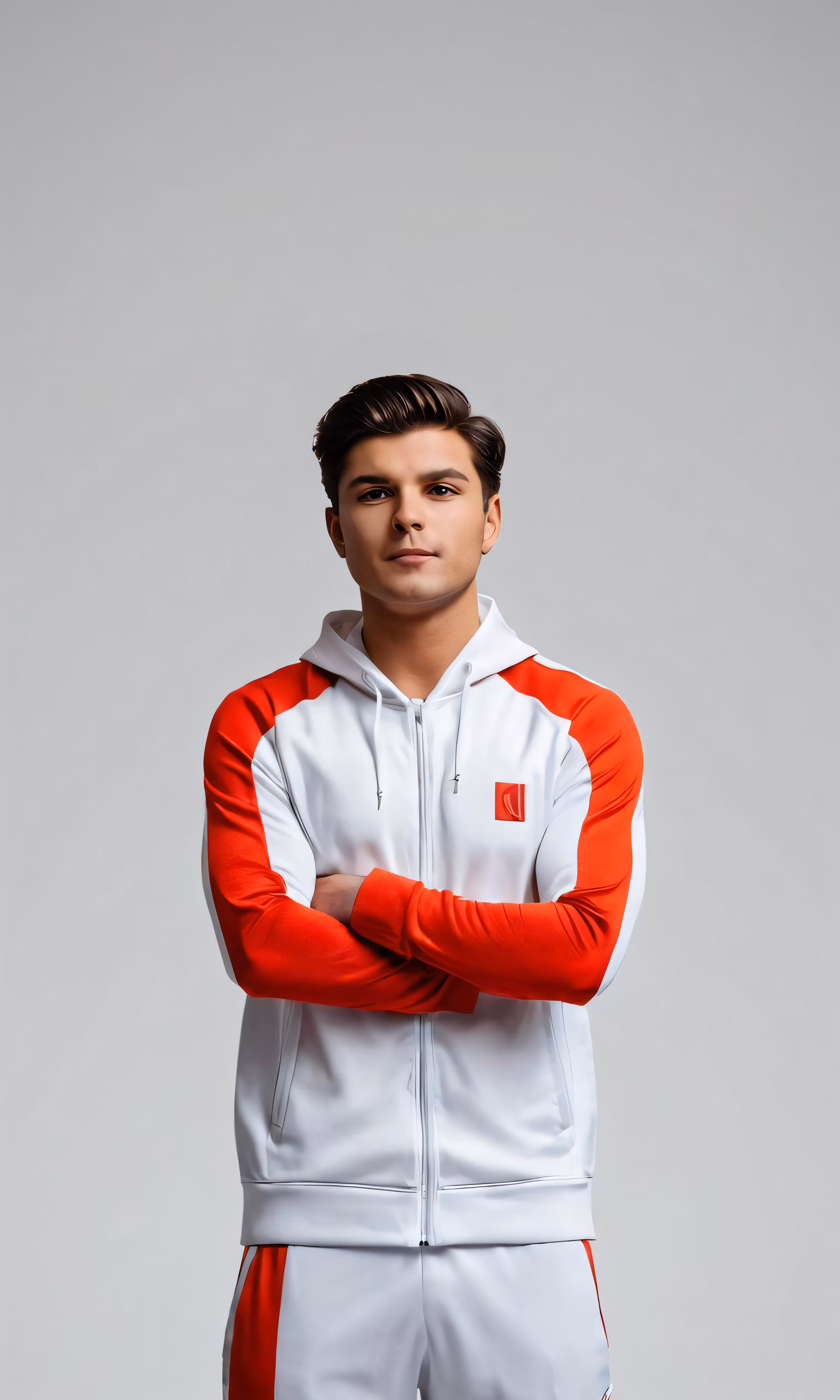 High resolution picture, free to use, a man posing for a portrait wearing a white and red track suit
