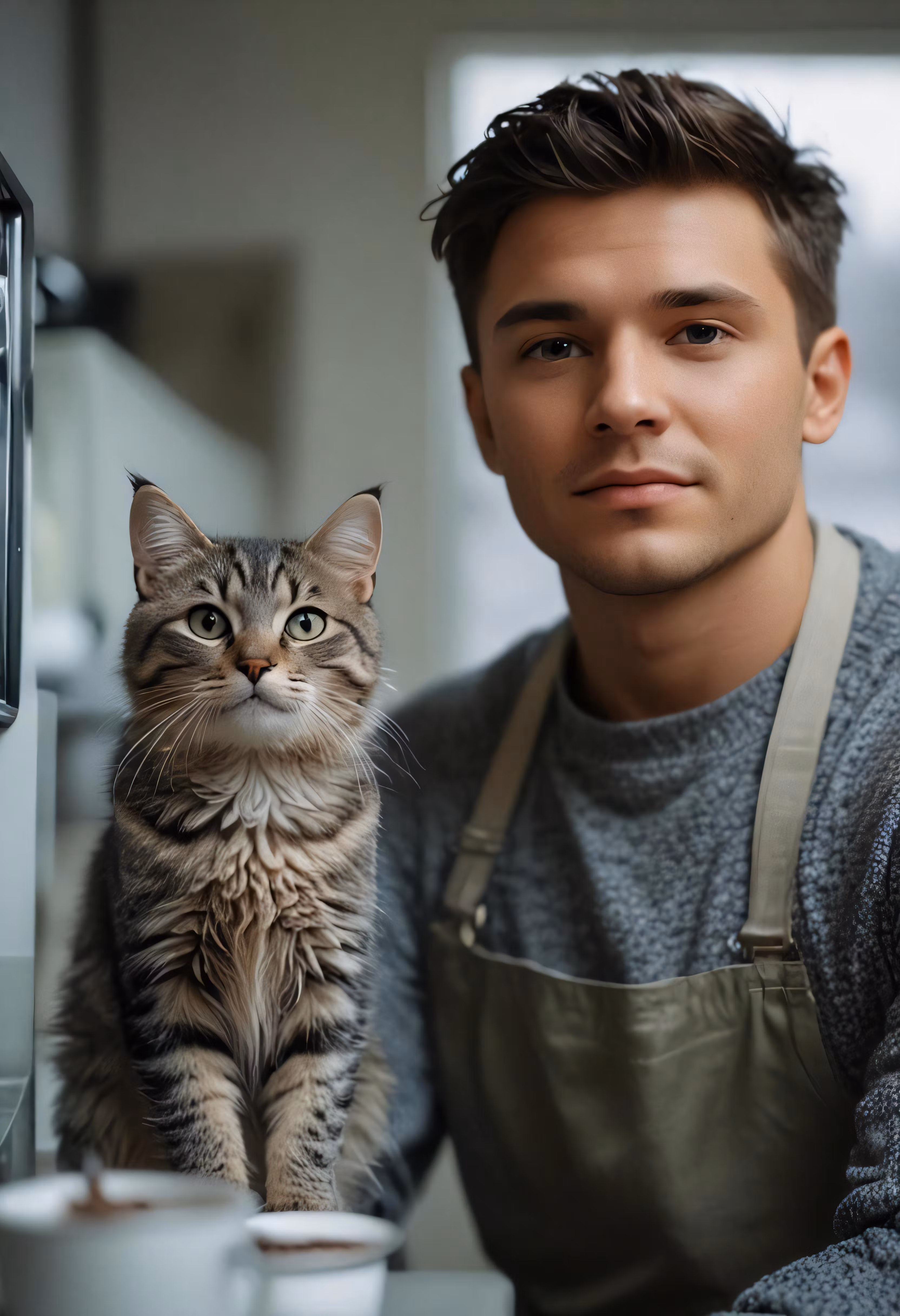High resolution picture, free to use, a man sitting at a kitchen counter with a cat near by