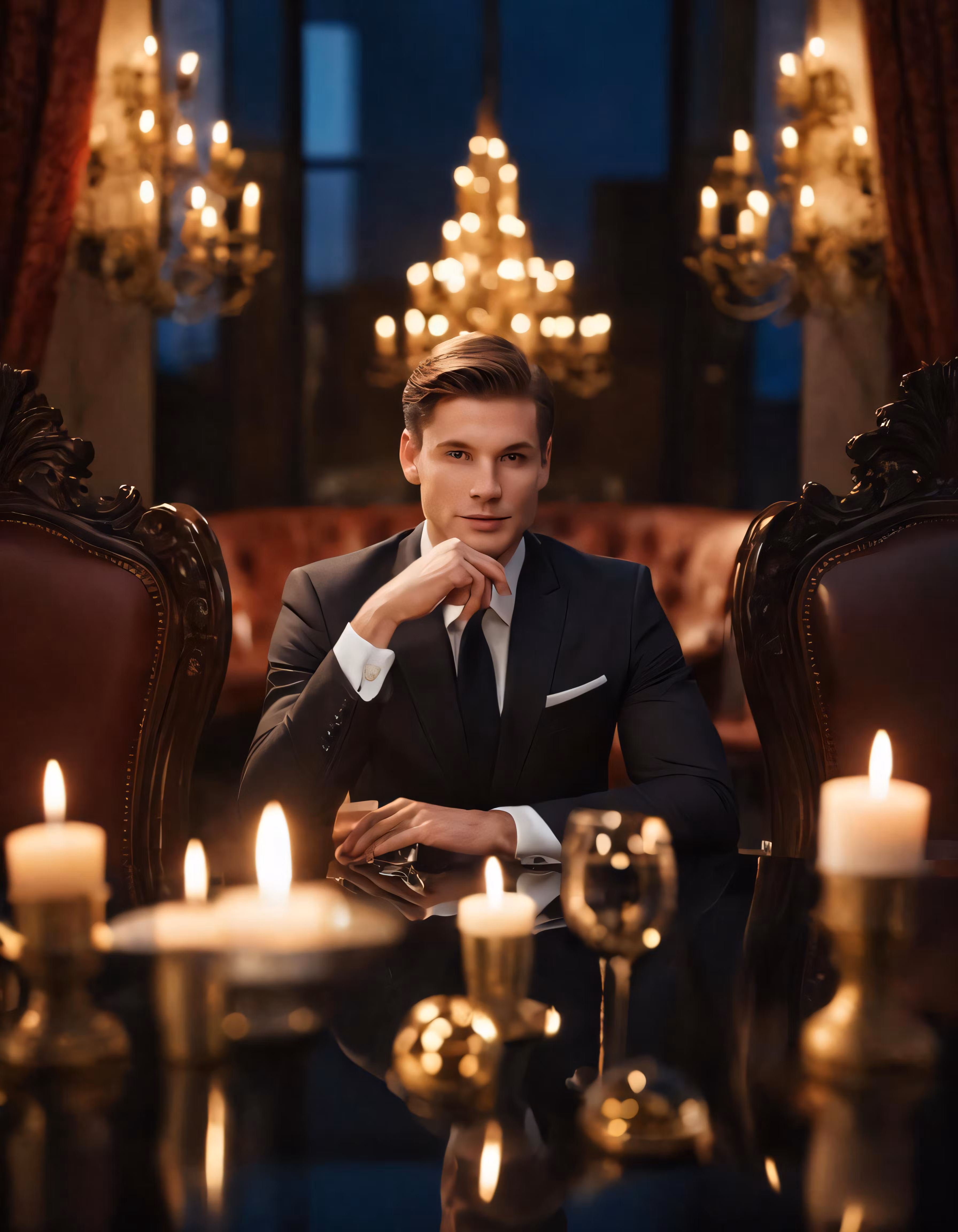 High resolution picture, free to use, a man sitting at a table in front of candles