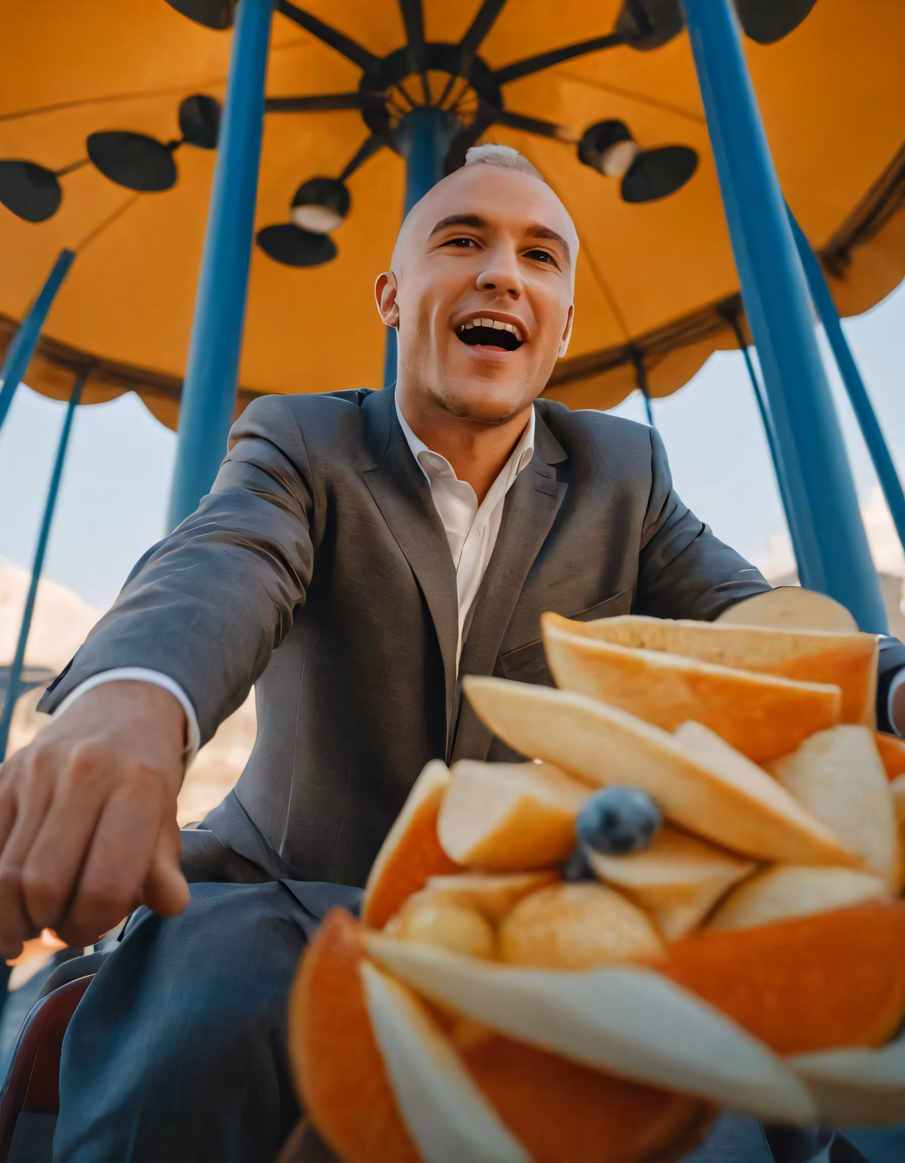 High resolution picture, free to use, a man sitting down holding an umbrella