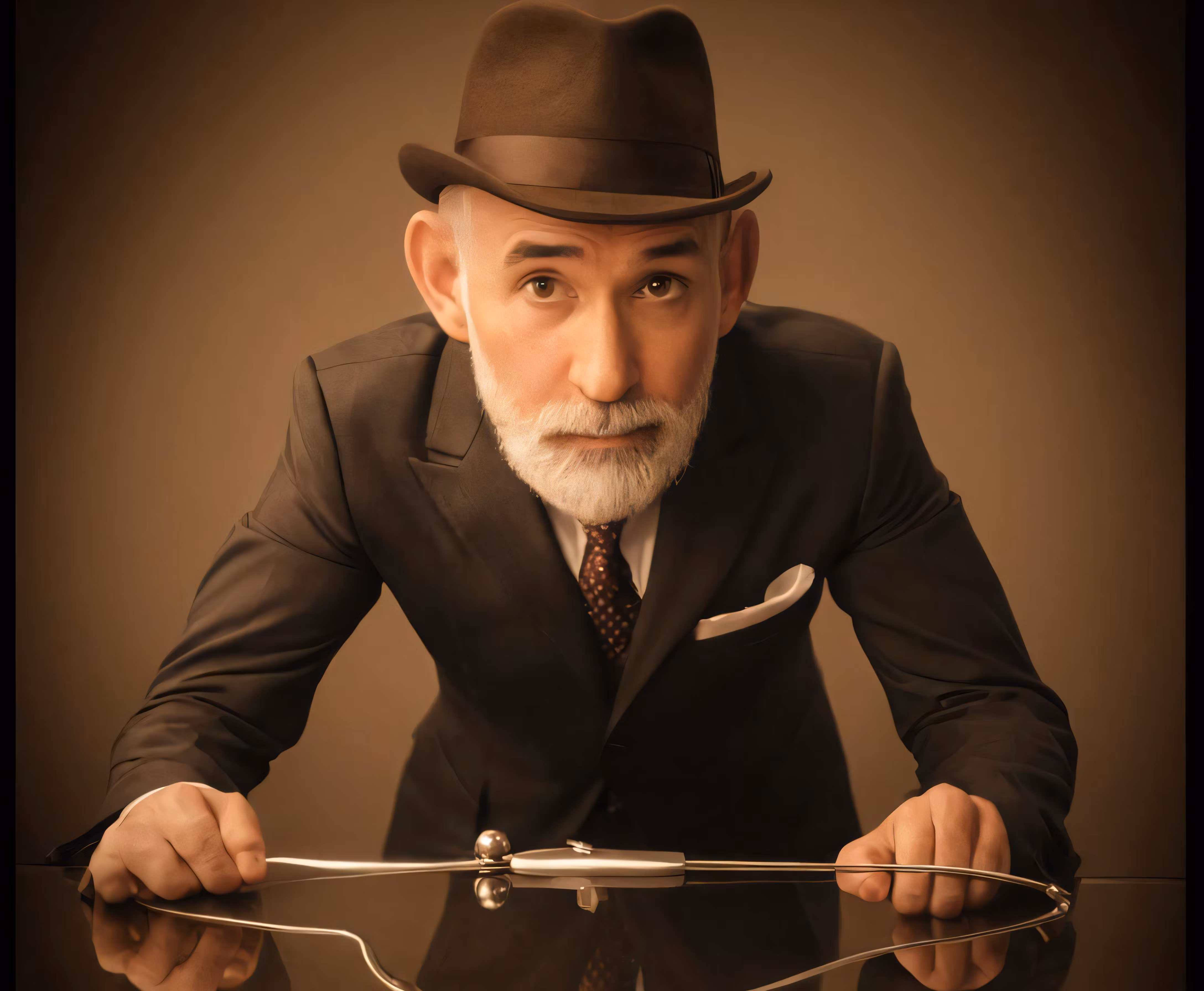 High resolution picture, free to use, a man sitting in front of a table with a fork and knife