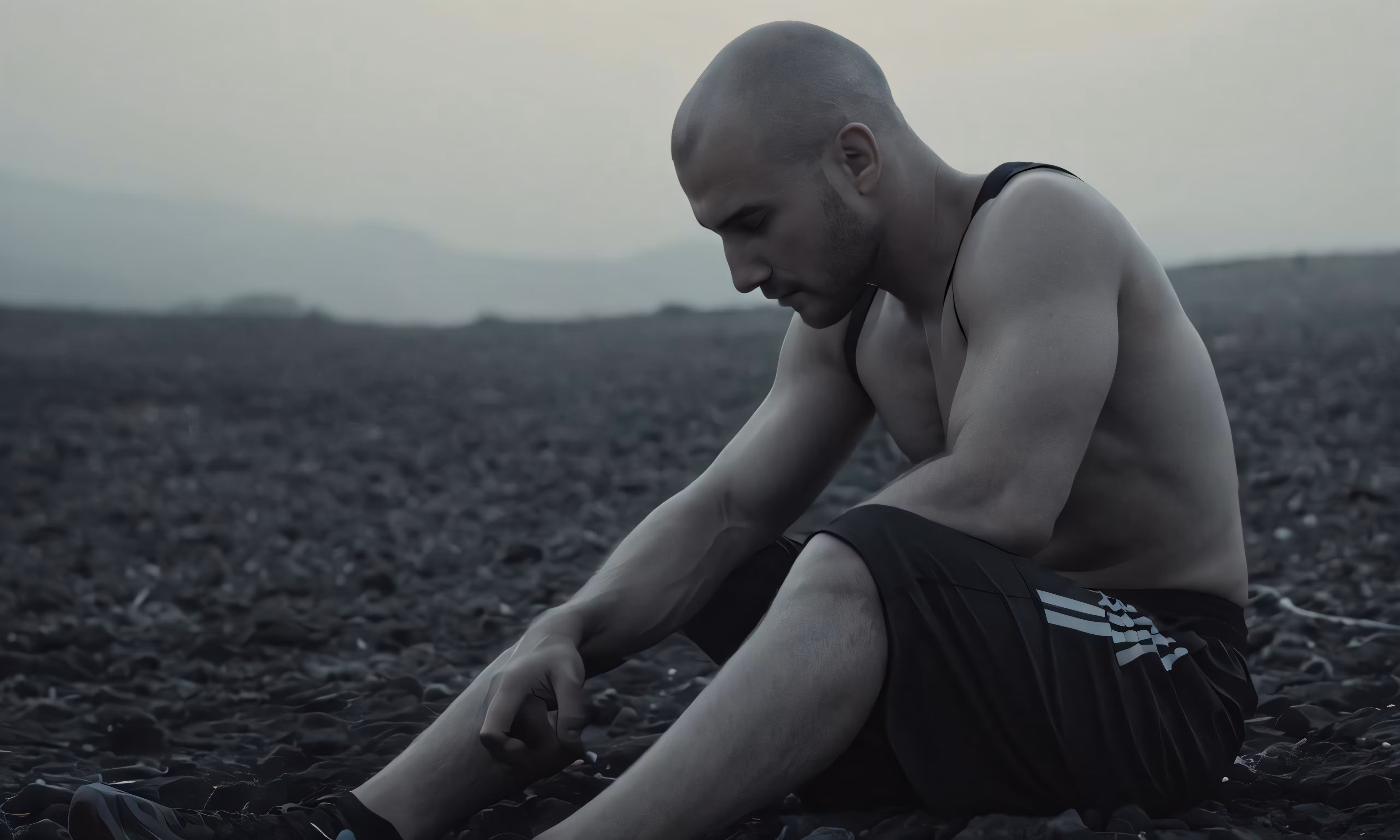 High resolution picture, free to use, a man sitting on the ground and touching his knees