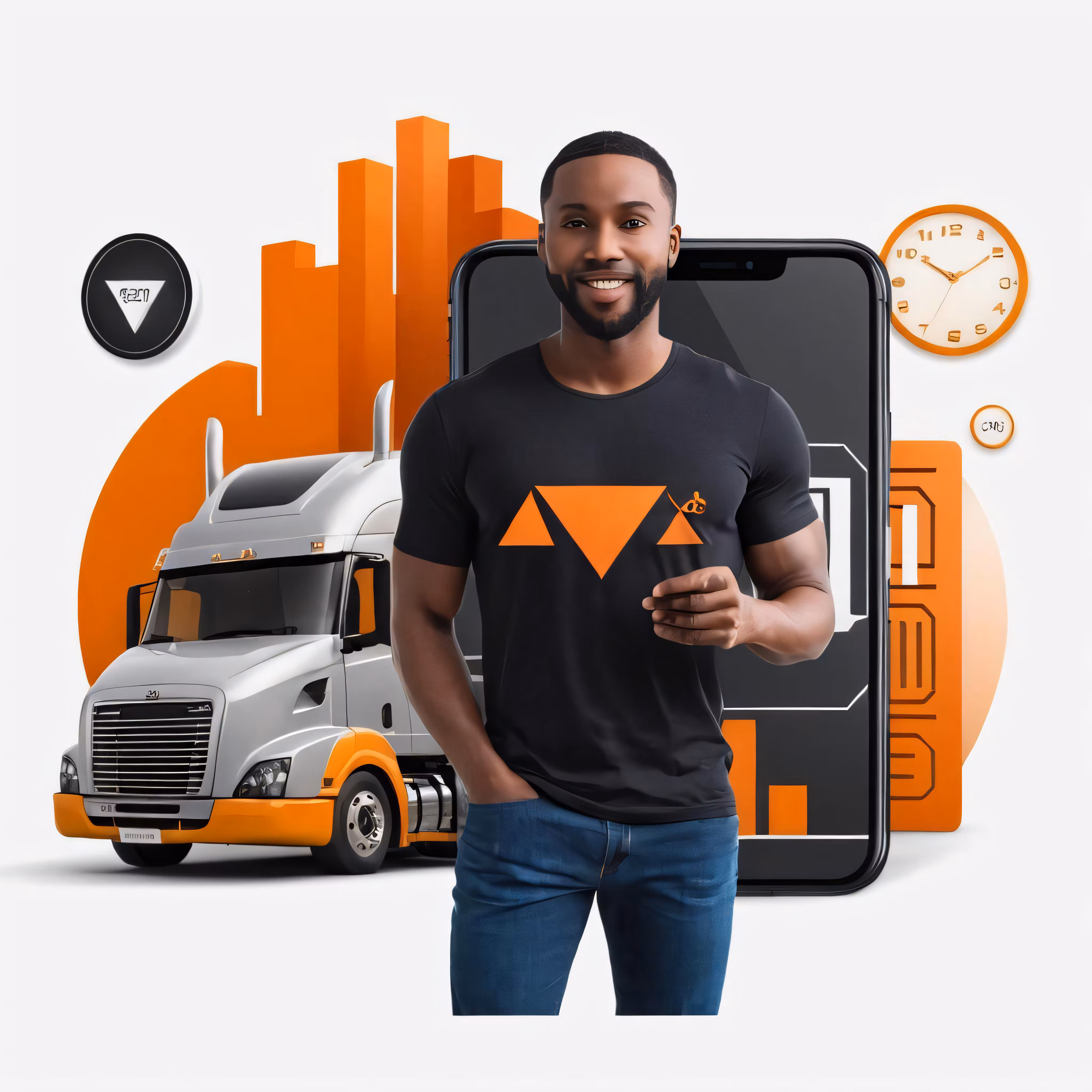 High resolution picture, free to use, a man standing in front of a cell phone with a truck on the screen