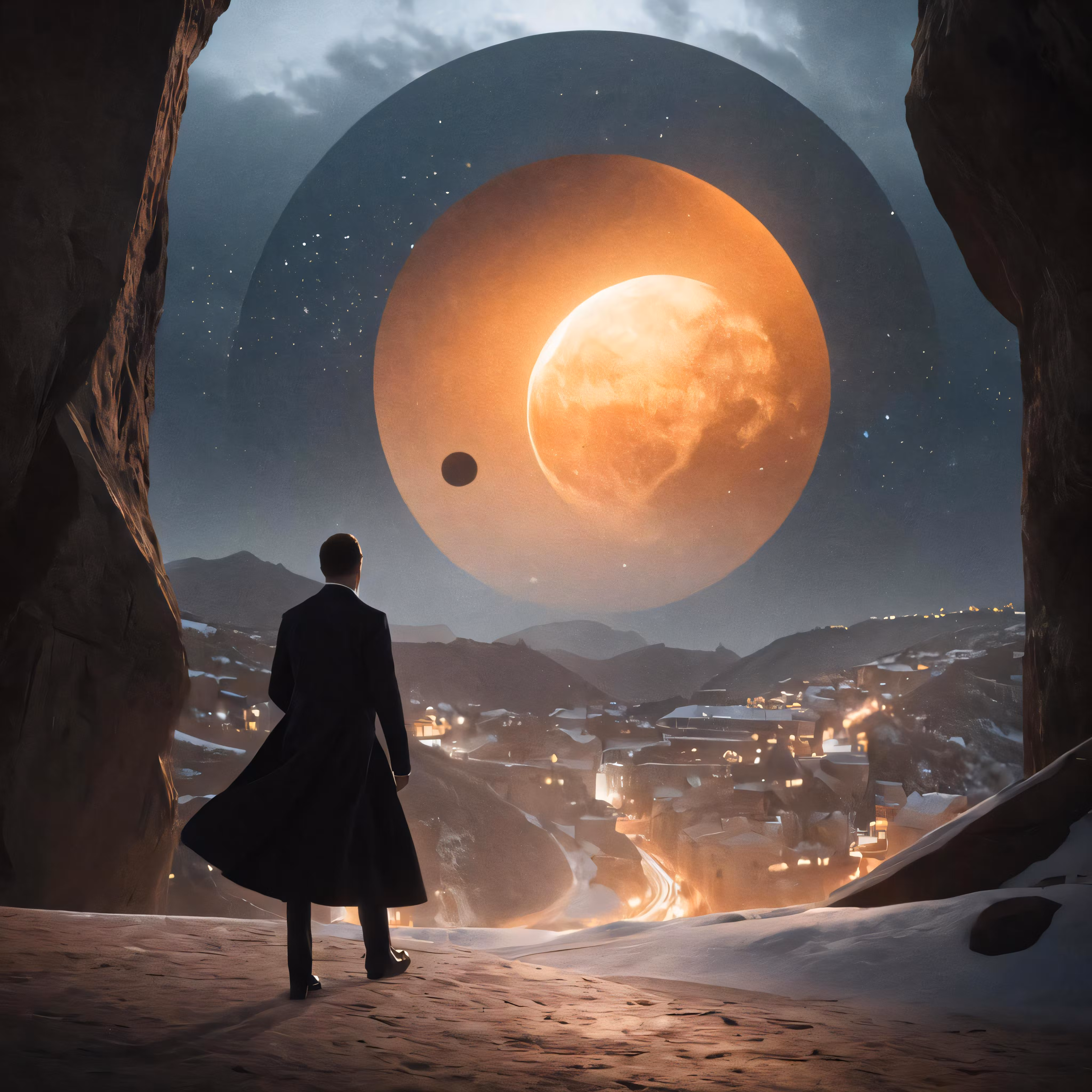 High resolution picture, free to use, a man standing in front of a huge object with mountains in the background
