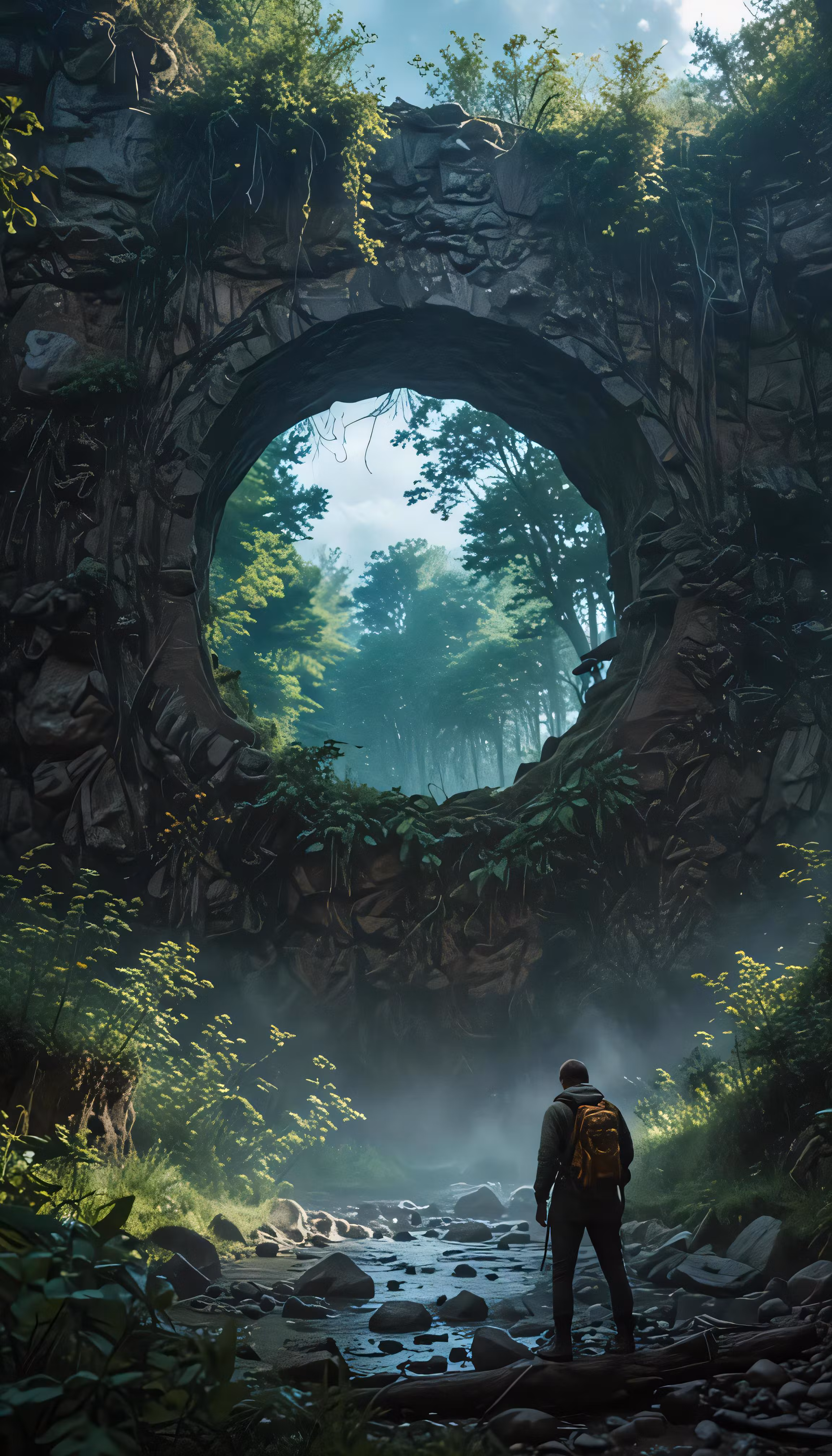 High resolution picture, free to use, a man standing in front of an abandoned forest portal