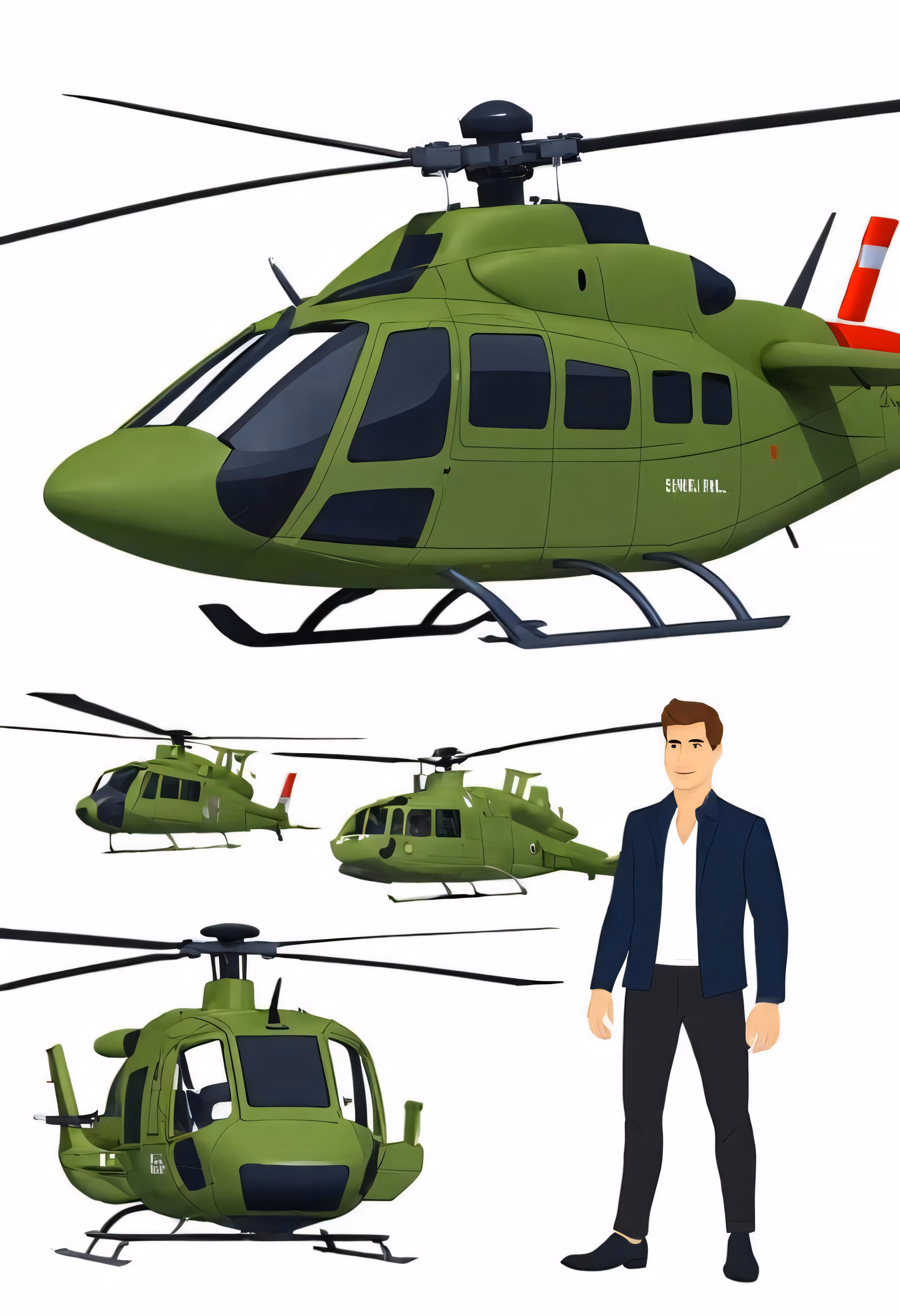 High resolution picture, free to use, a man standing in front of two green helicopters