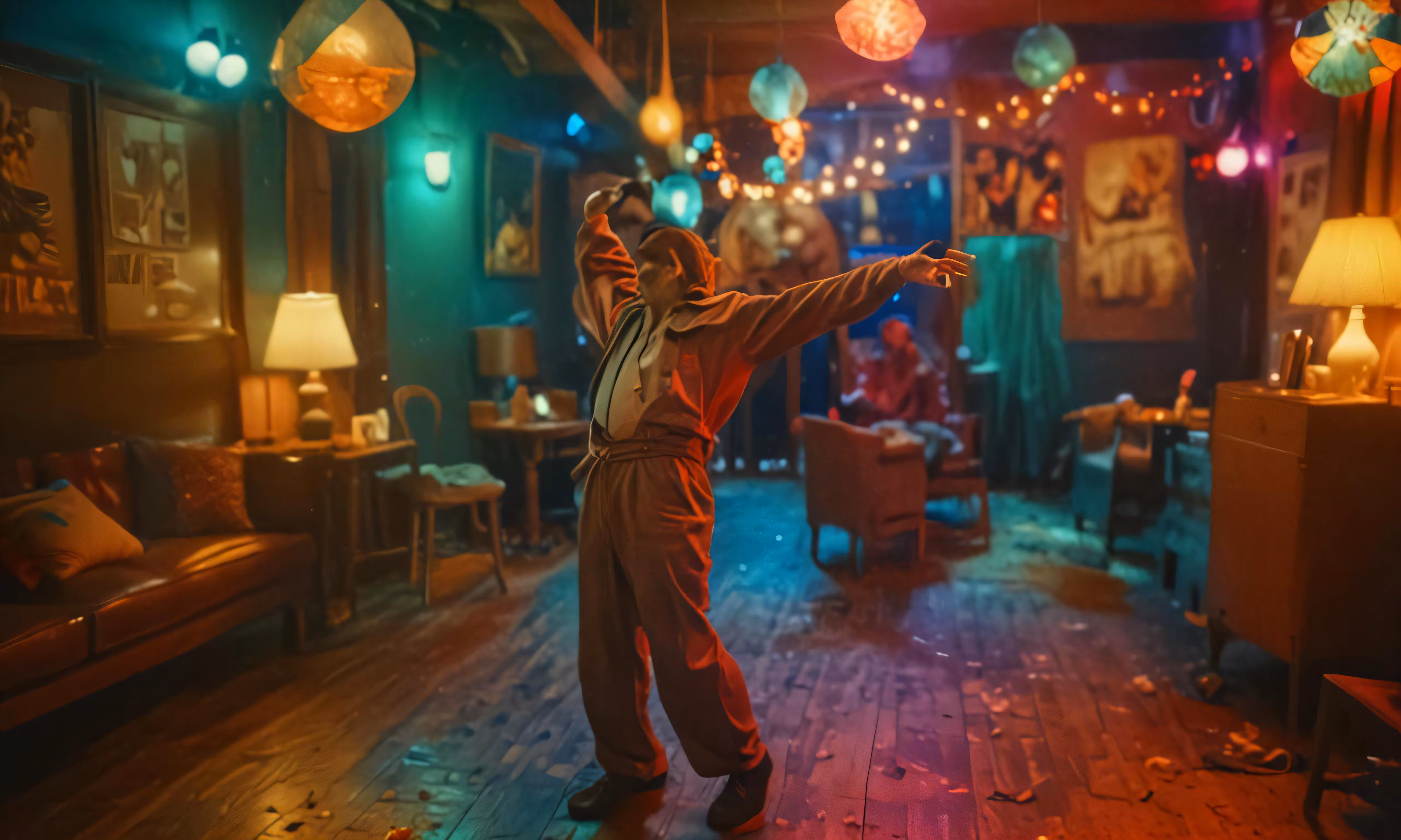 High resolution picture, free to use, a man standing on the floor in a room that has some lights hanging from it