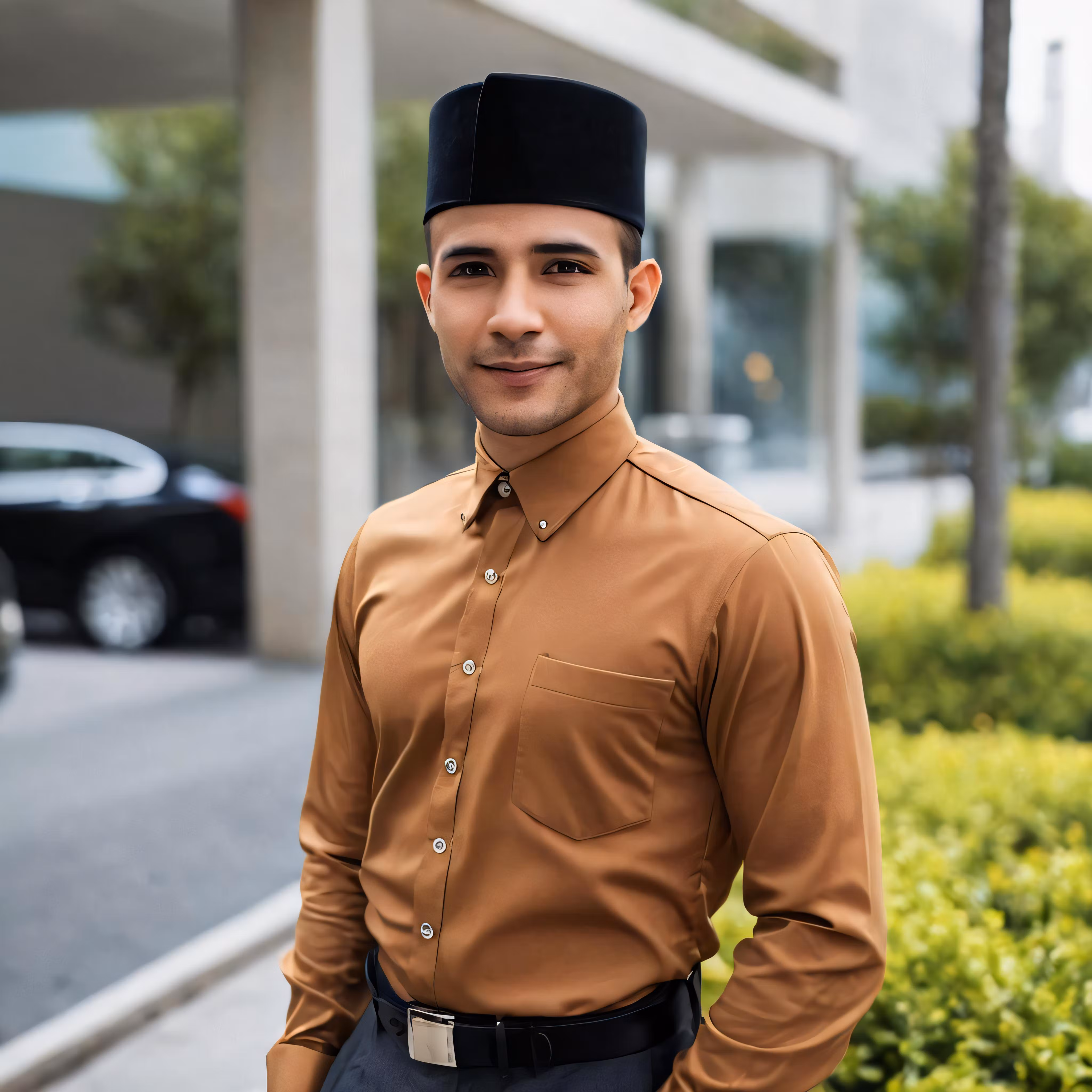 High resolution picture, free to use, a man standing on the side walk of a building wearing a brown shirt and black cap