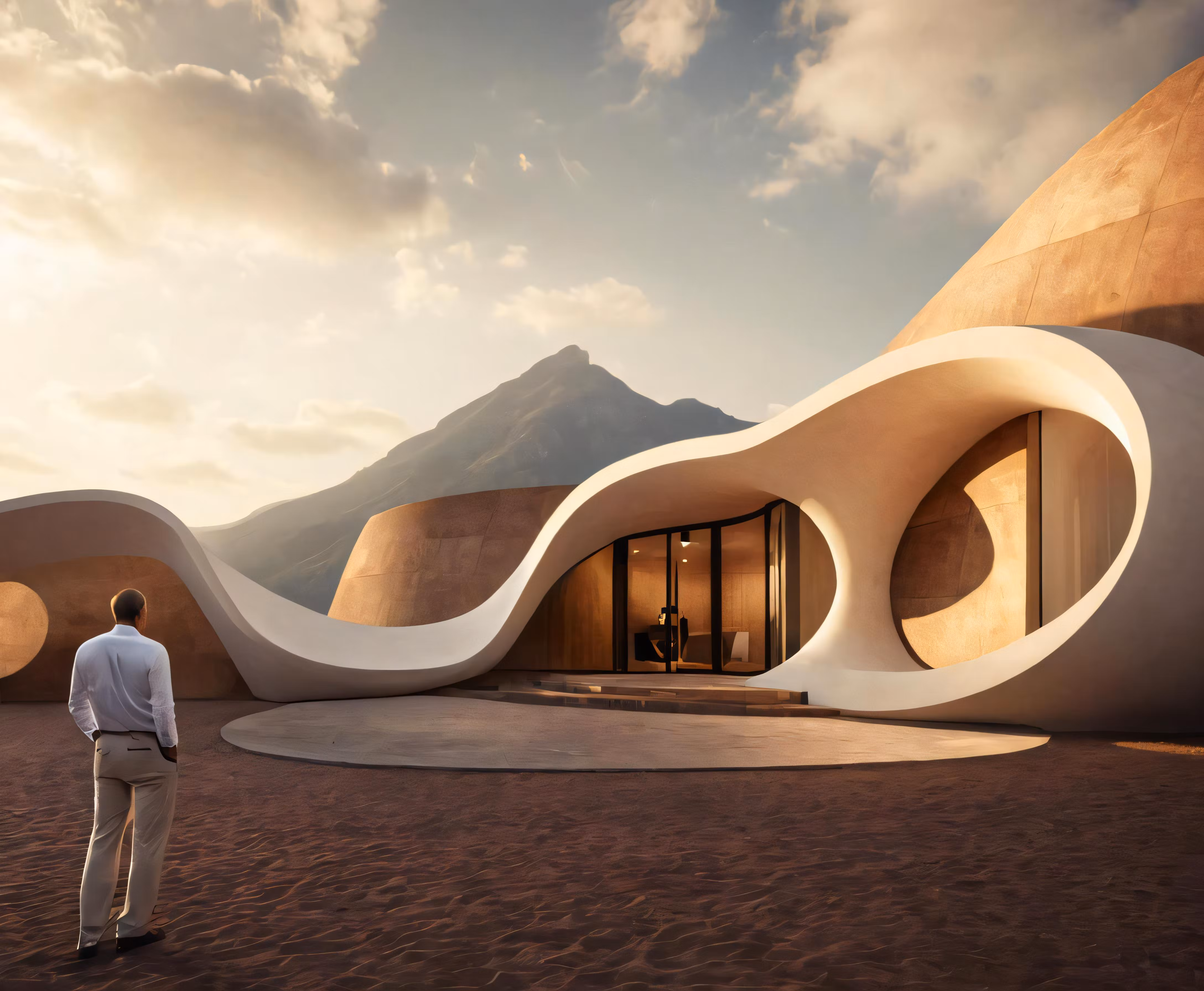 High resolution picture, free to use, a man standing outside a building with a mountain in the background