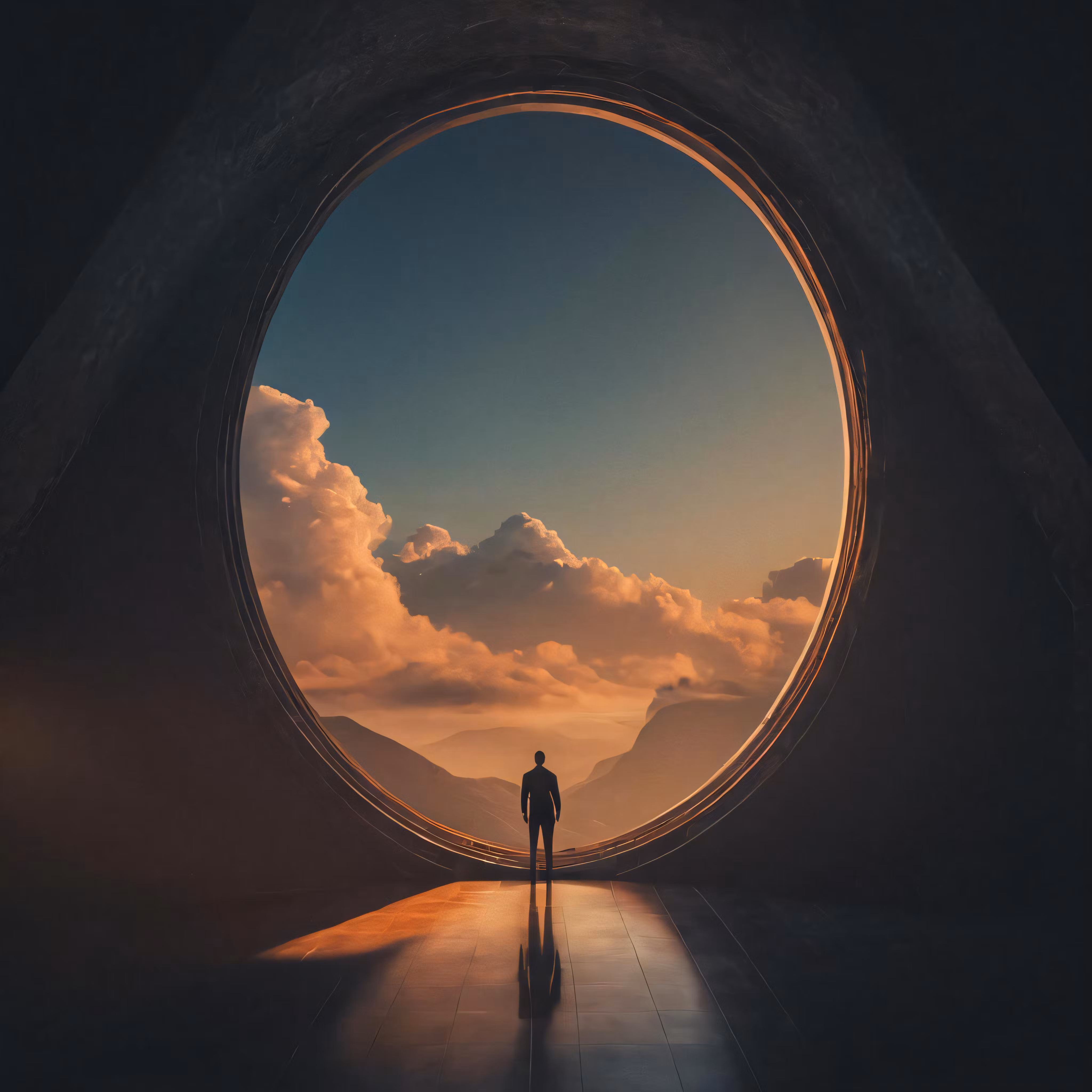 High resolution picture, free to use, a man stands in the end of a tunnel under a cloudy sky