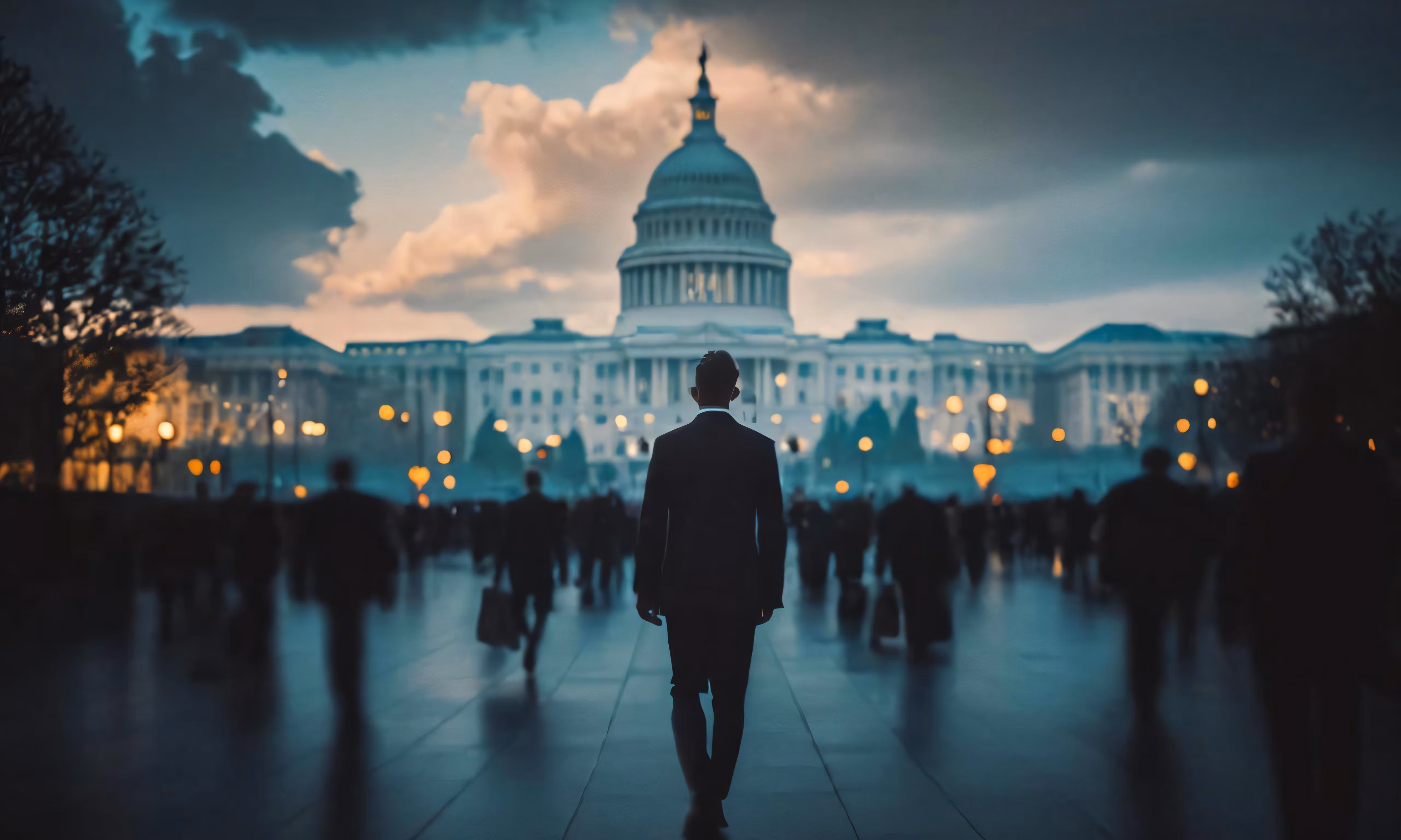 High resolution picture, free to use, a man walks past a group of people walking in the distance at dusk