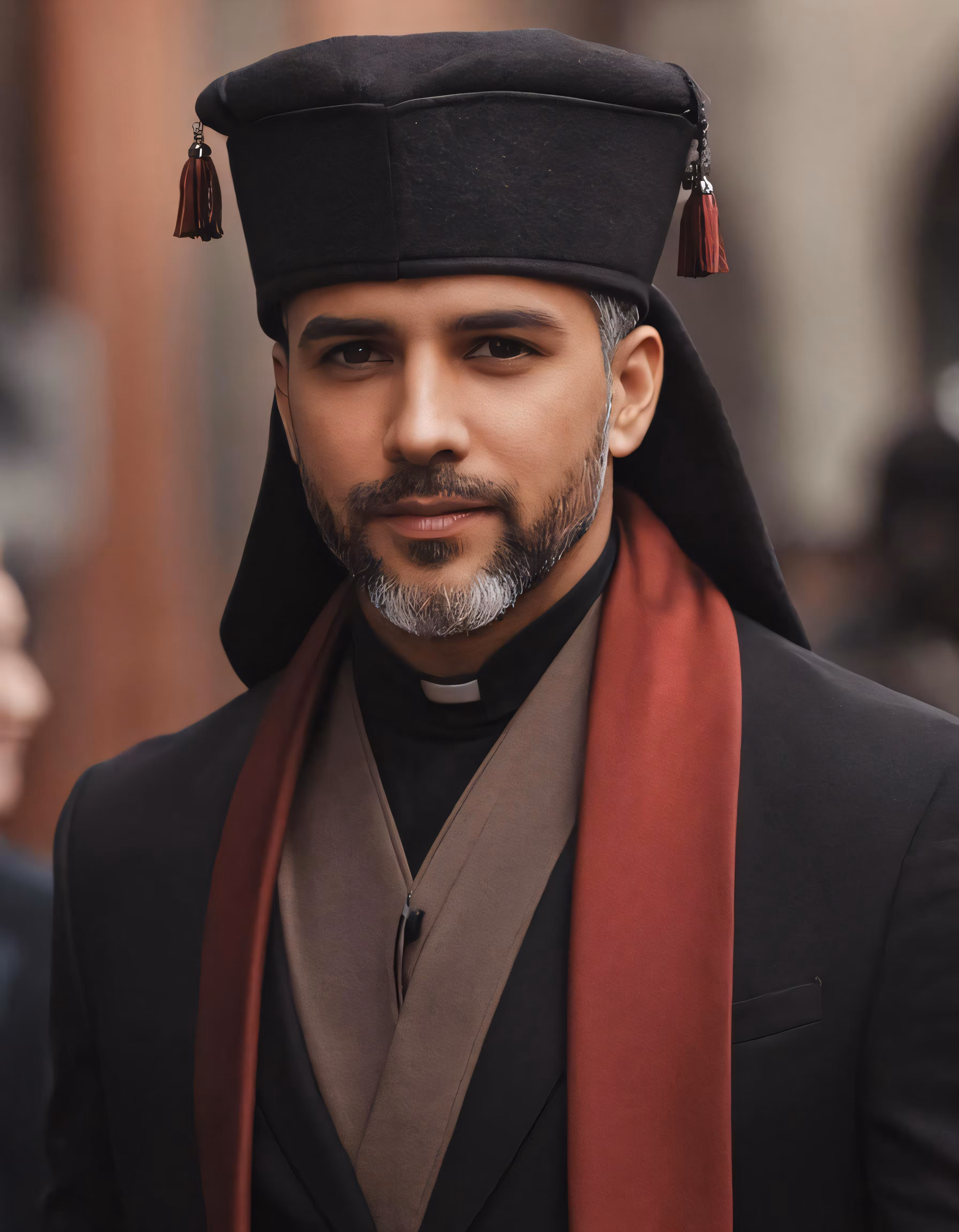 High resolution picture, free to use, a man wearing a black outfit and red stole