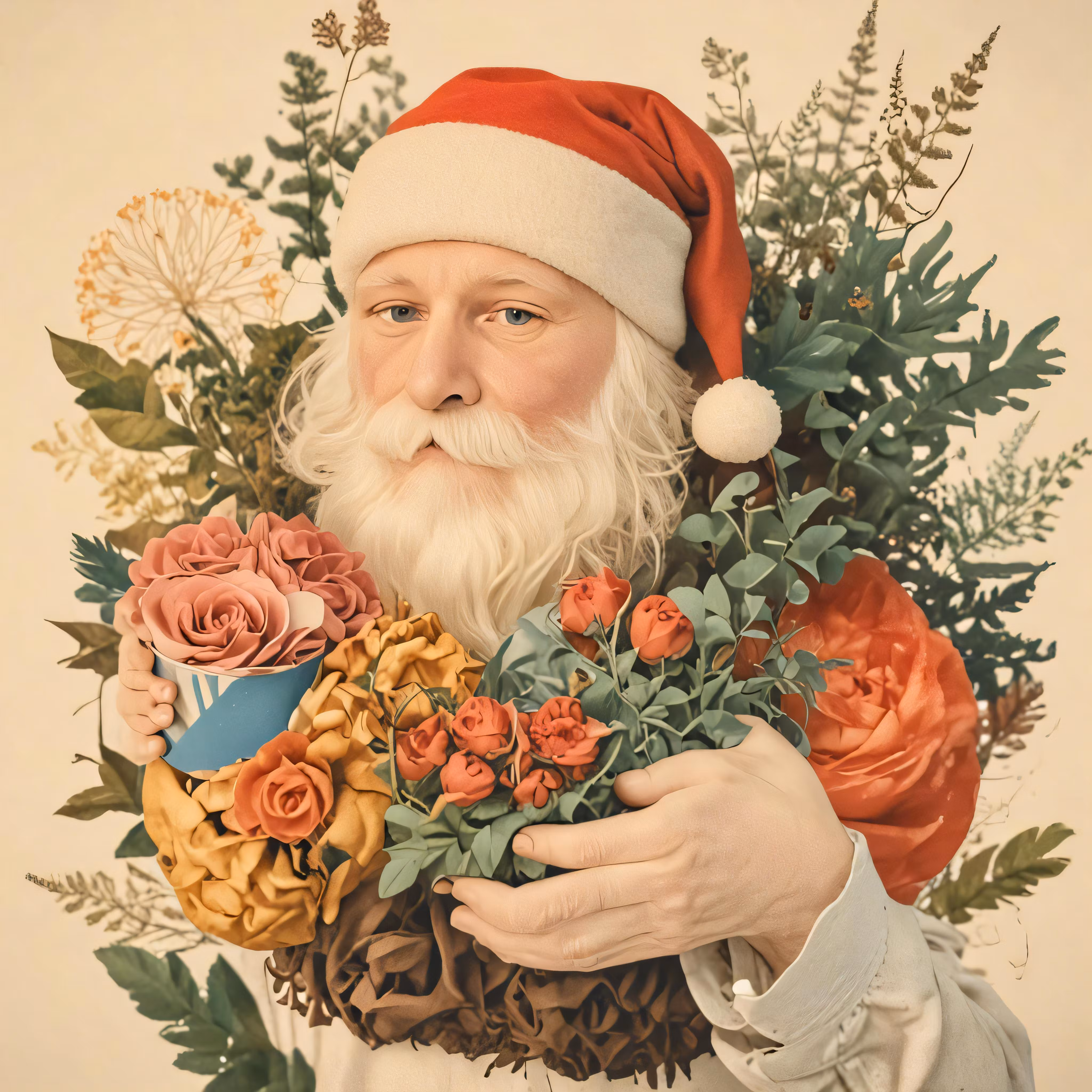 High resolution picture, free to use, a man wearing a santa hat and holding a bunch of flowers