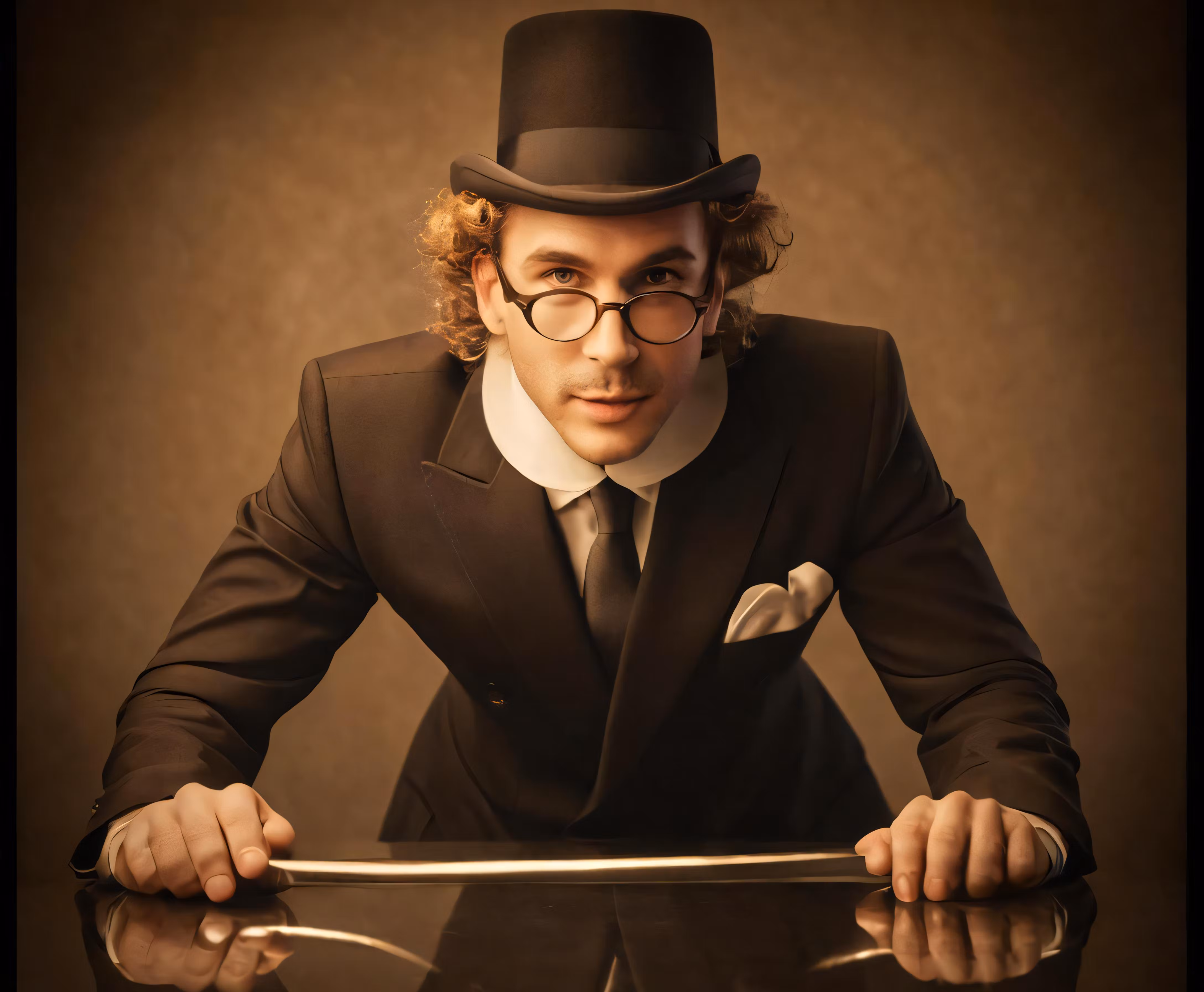 High resolution picture, free to use, a man wearing a suit and hat poses with an instrument