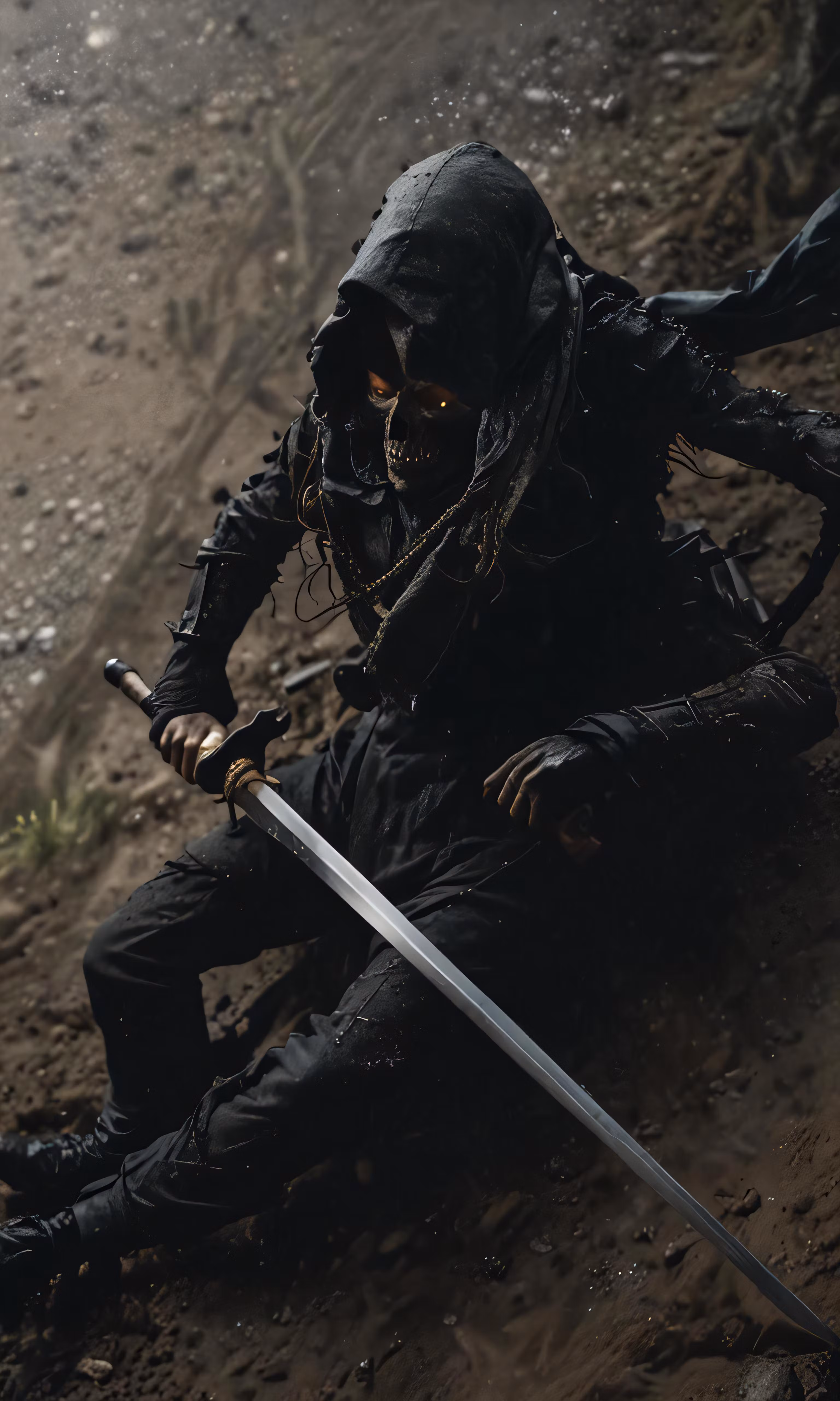 High resolution picture, free to use, a man with a horned face and black head sitting on the ground