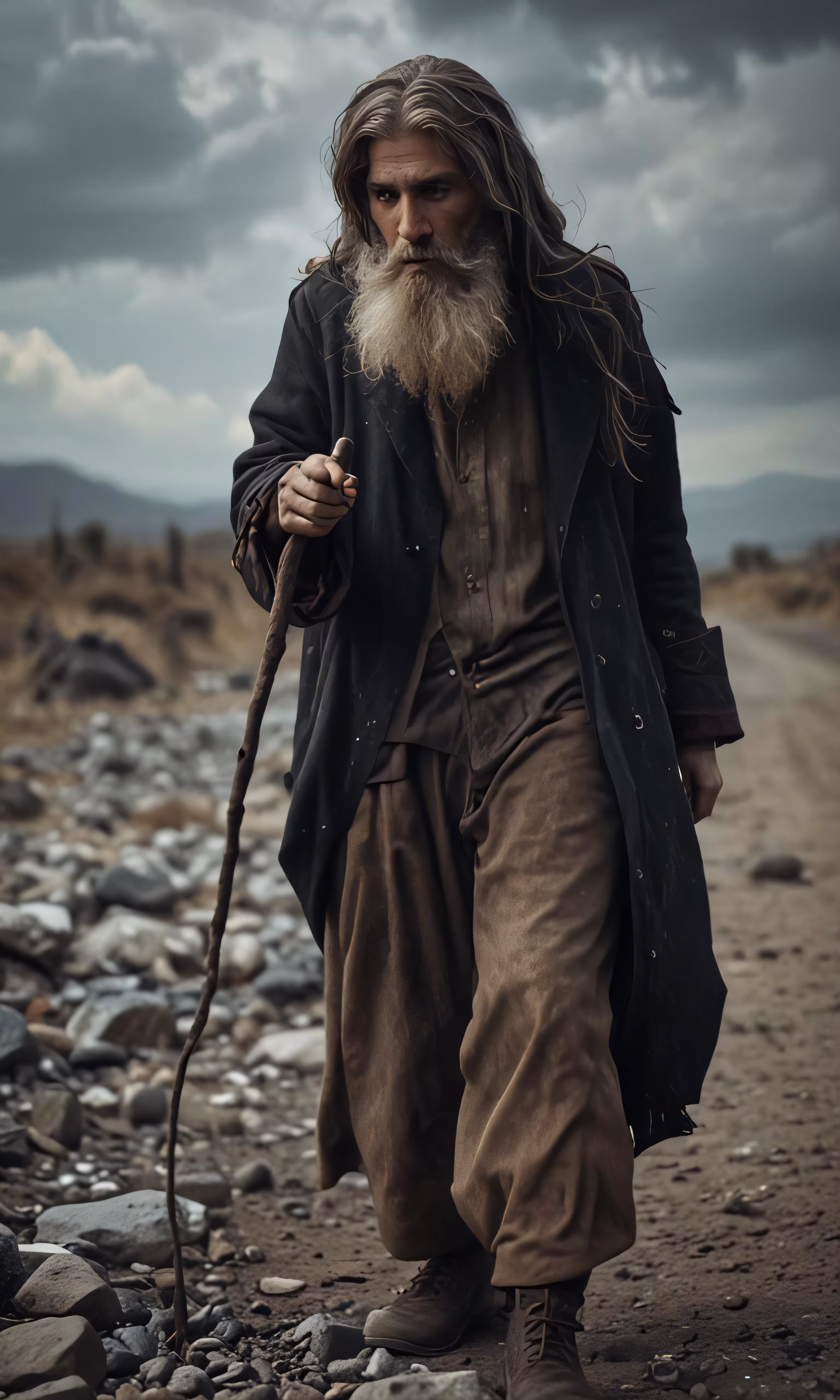 High resolution picture, free to use, a man with long hair is walking on rocks
