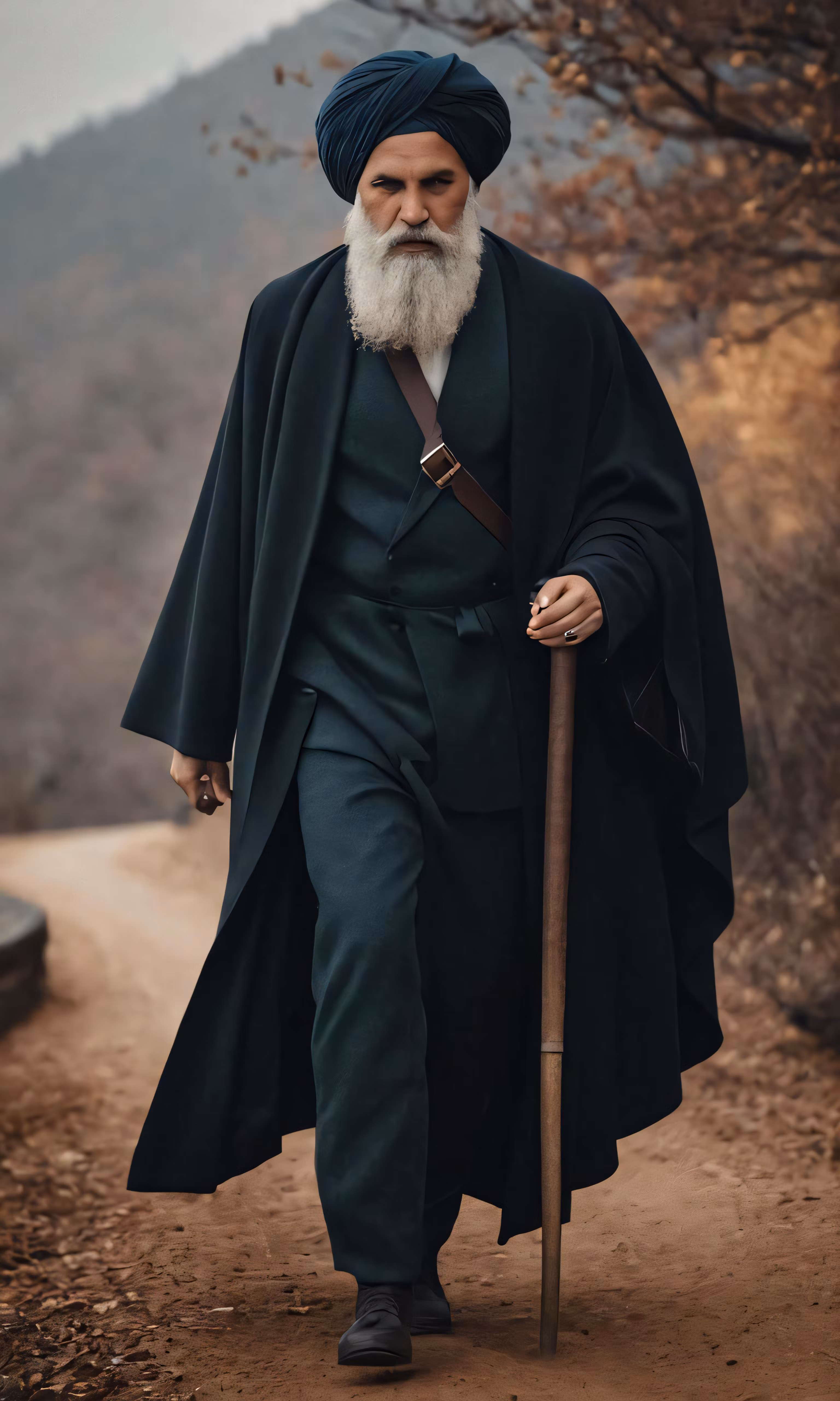 High resolution picture, free to use, a man with white beard and long coat walking down a dirt road