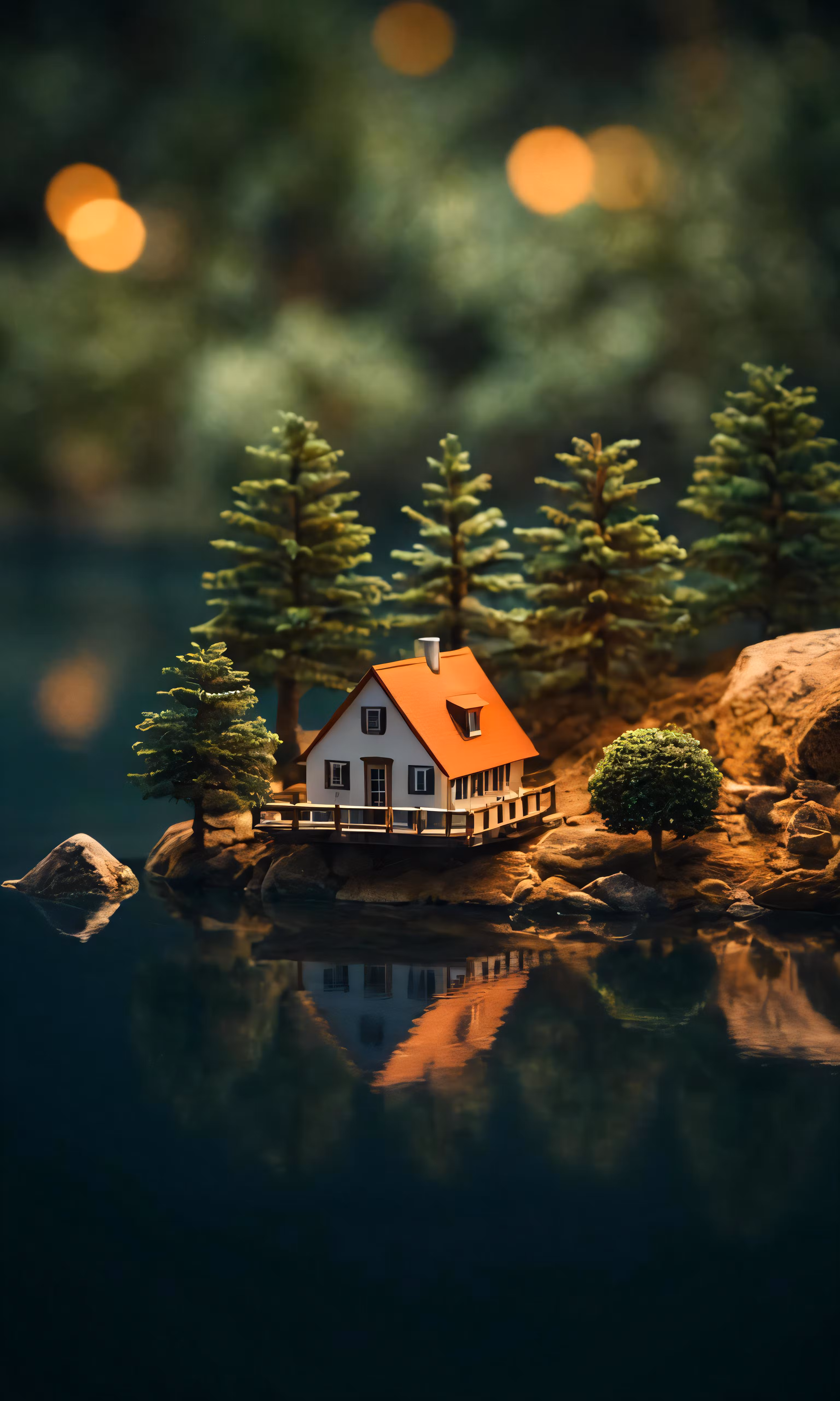 High resolution picture, free to use, a miniature house sits on an island with trees around it