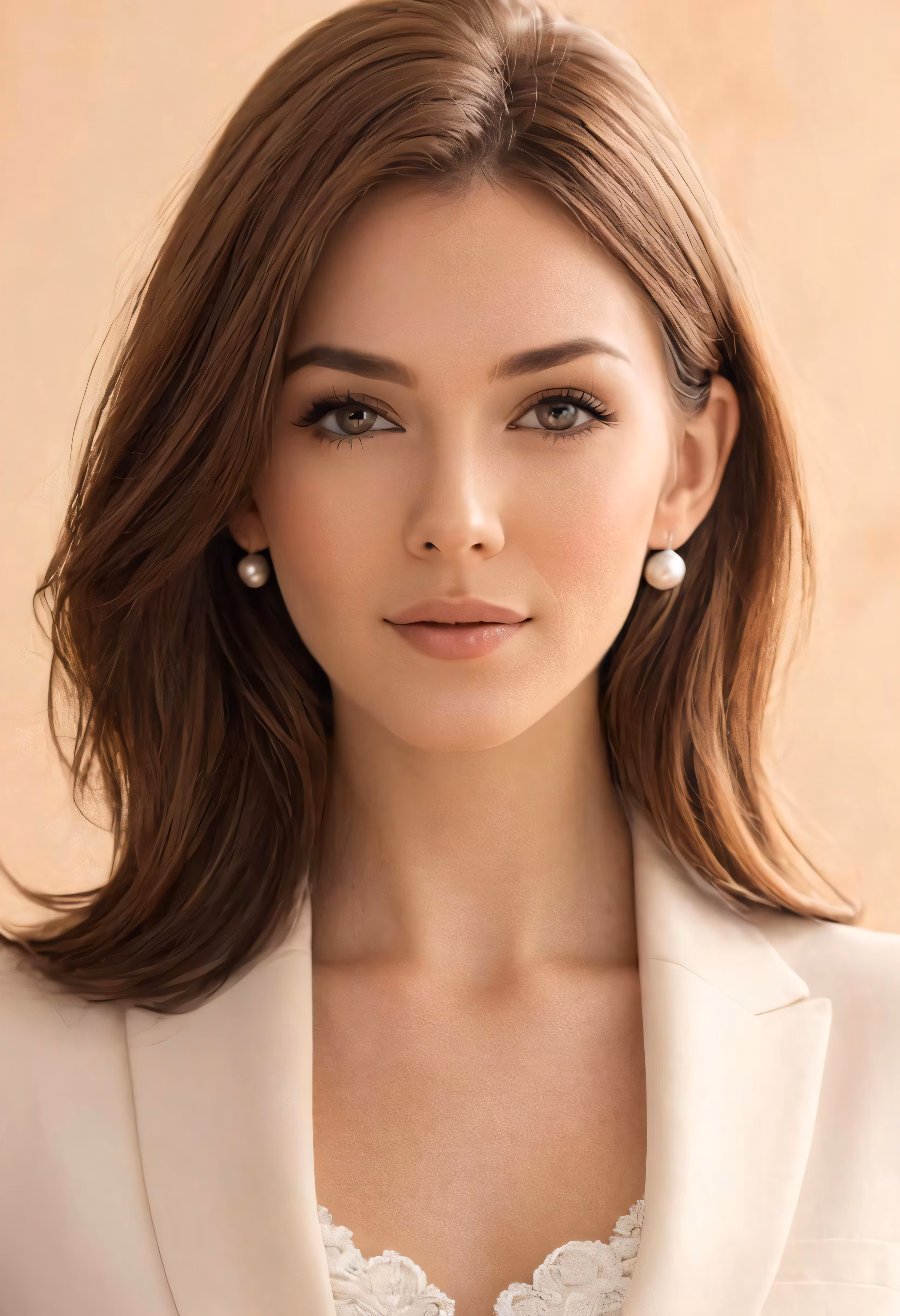 High resolution picture, free to use, a model with white blazer and pearl earrings