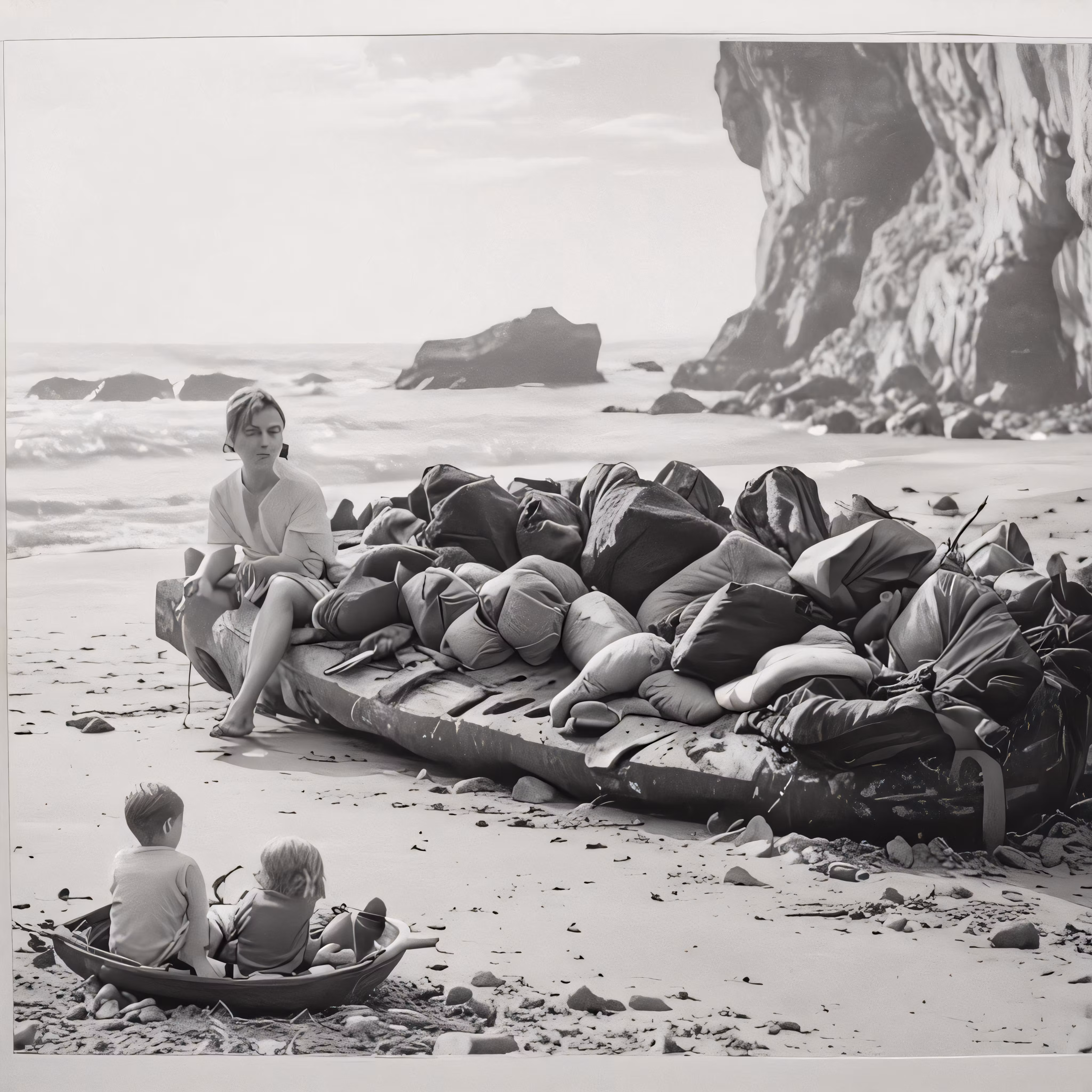 High resolution picture, free to use, a mother and her children setting up an open raft on the beach