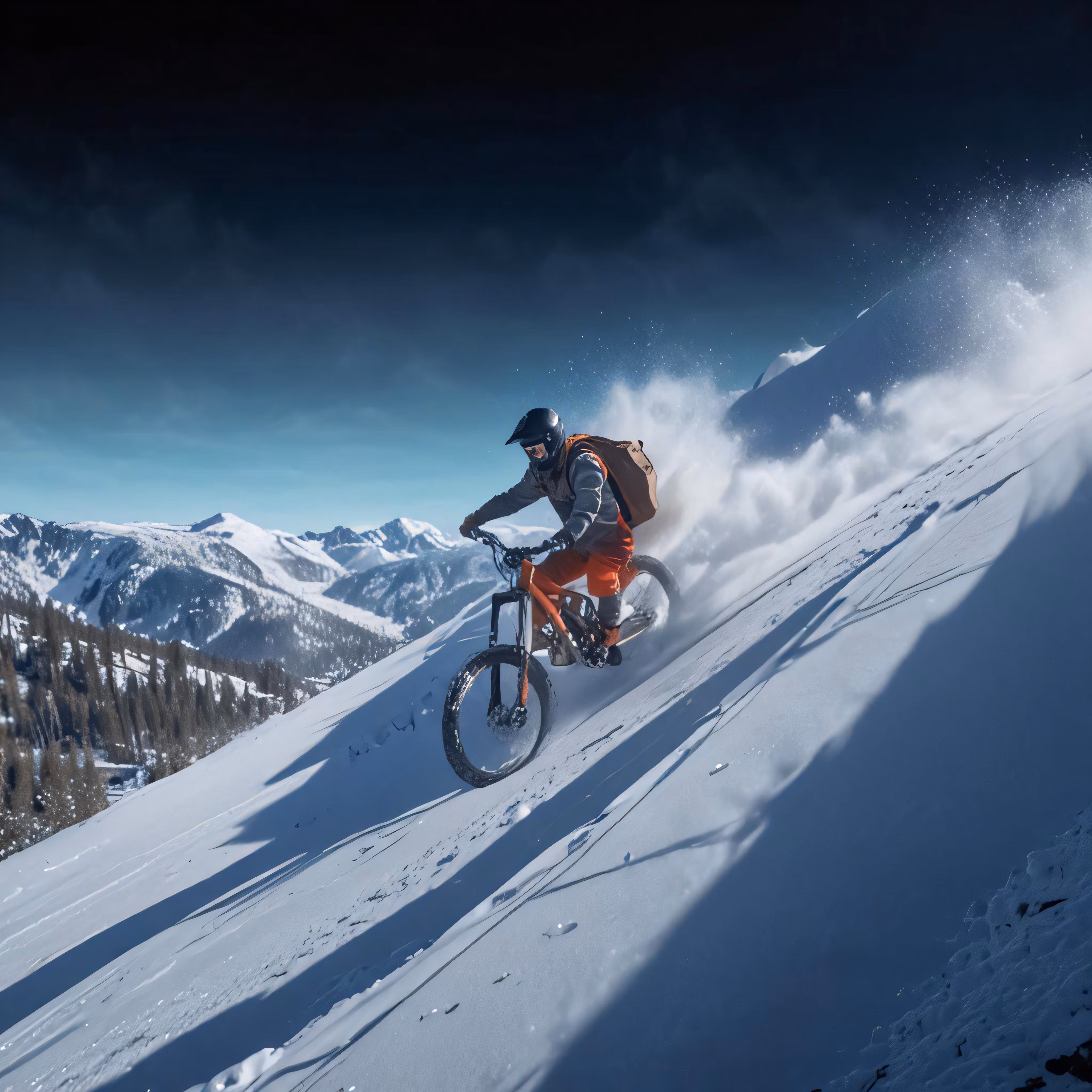 High resolution picture, free to use, a mountain biker rides down the side of a snowy slope