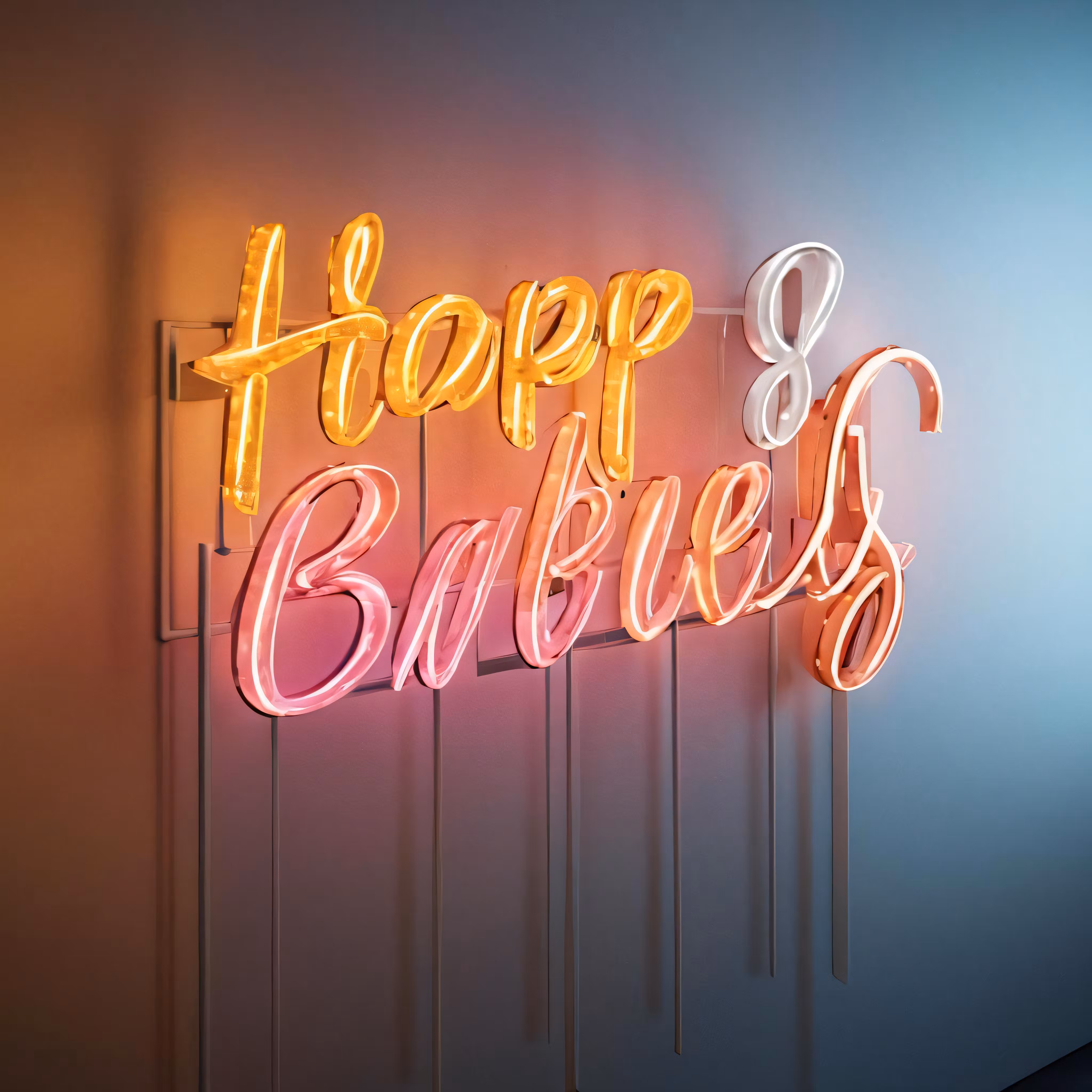High resolution picture, free to use, a neon sign that says happy 8 bites