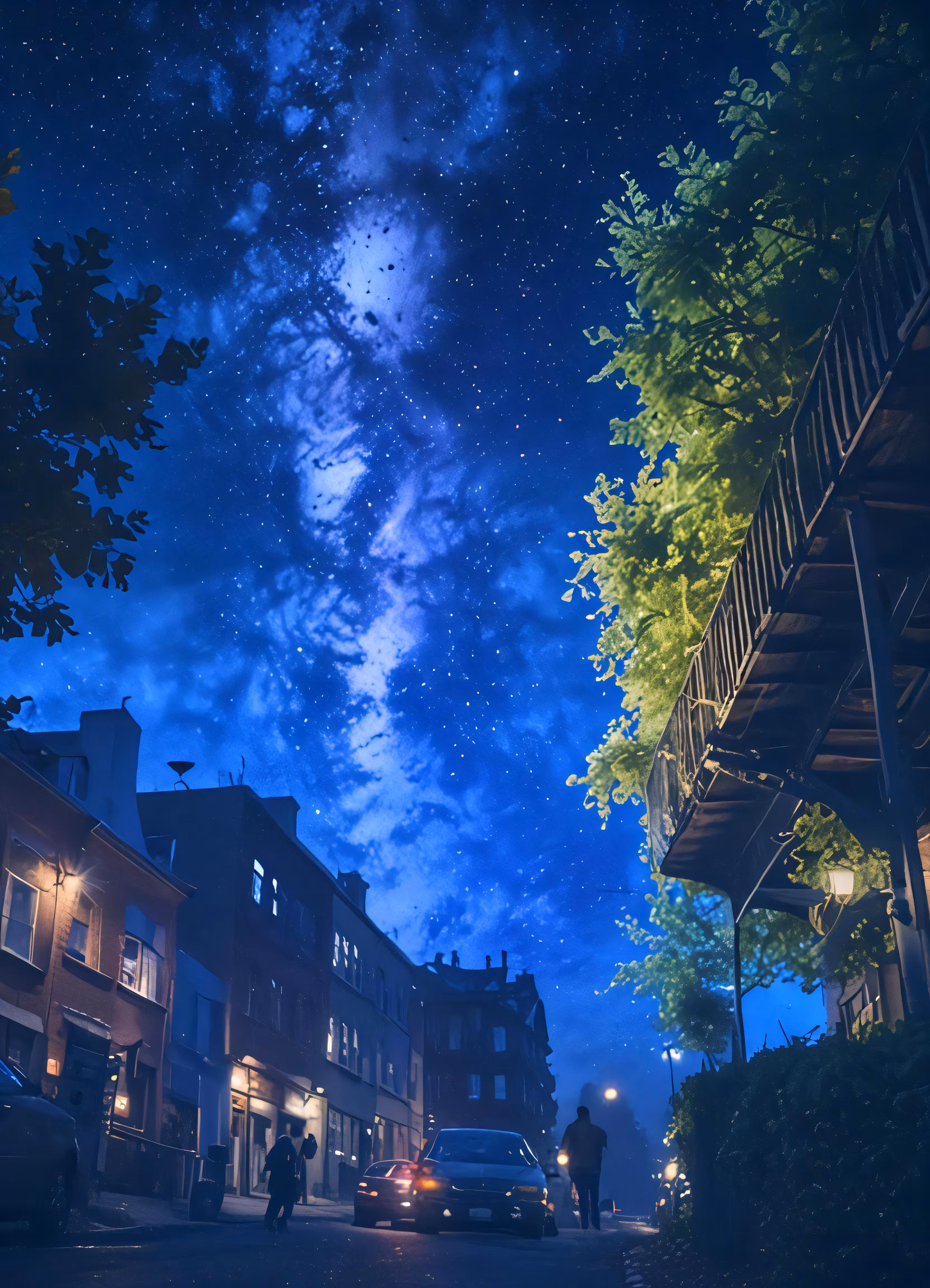 High resolution picture, free to use, a night view of an inner city, in the foreground with stars above