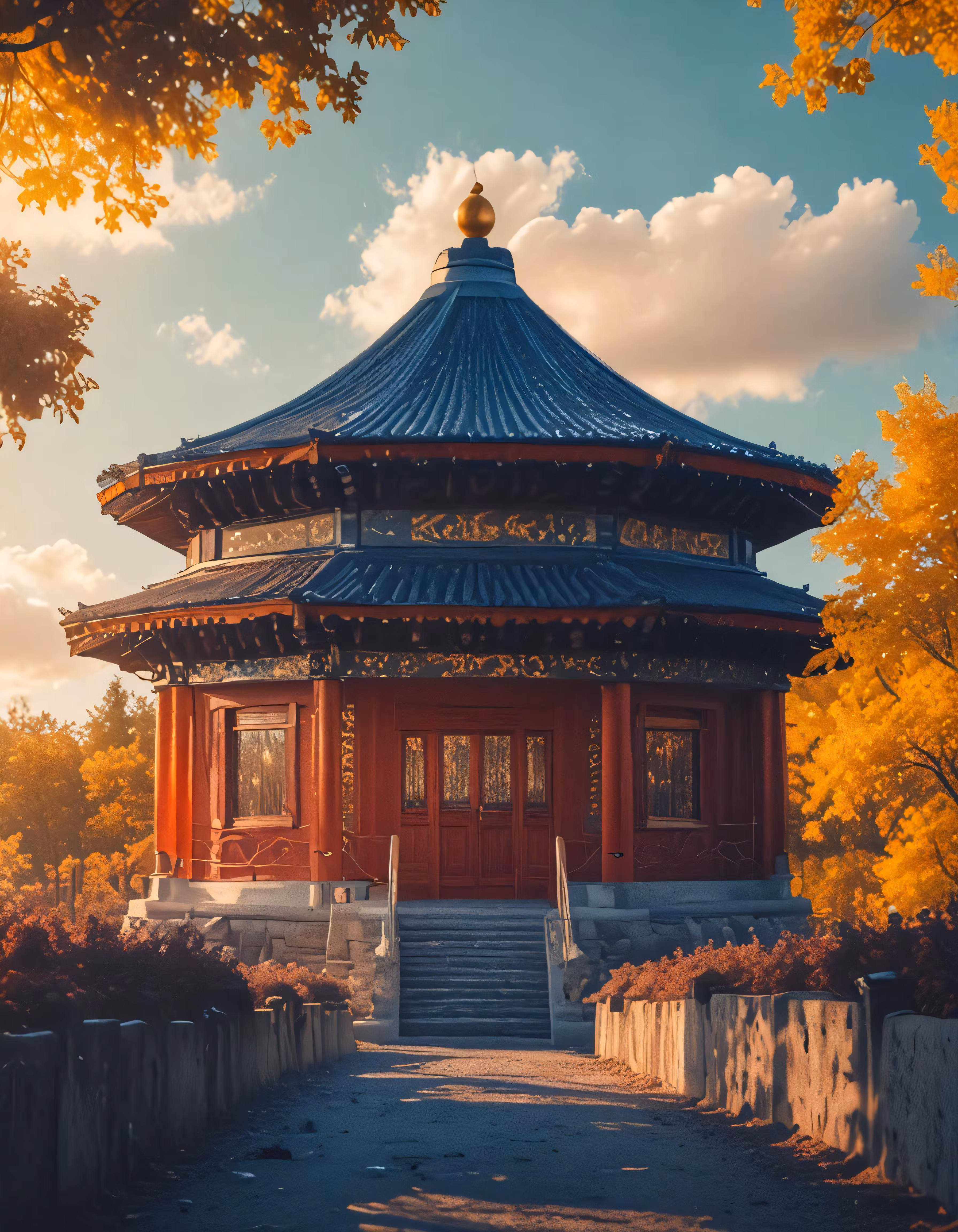 High resolution picture, free to use, a pagoda stands outside near autumn foliage