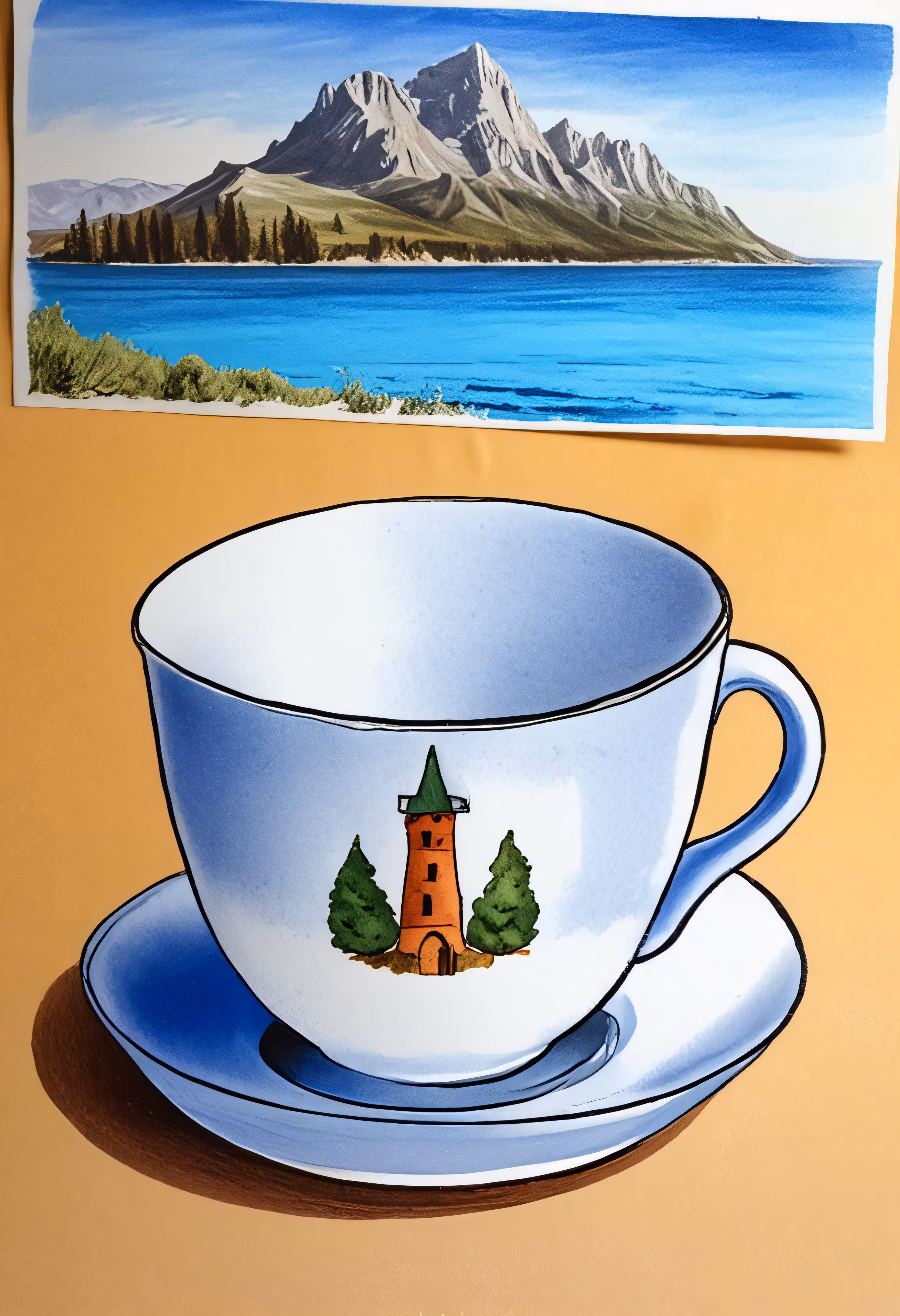 High resolution picture, free to use, a painting depicting a tea cup with a scenic mountain view