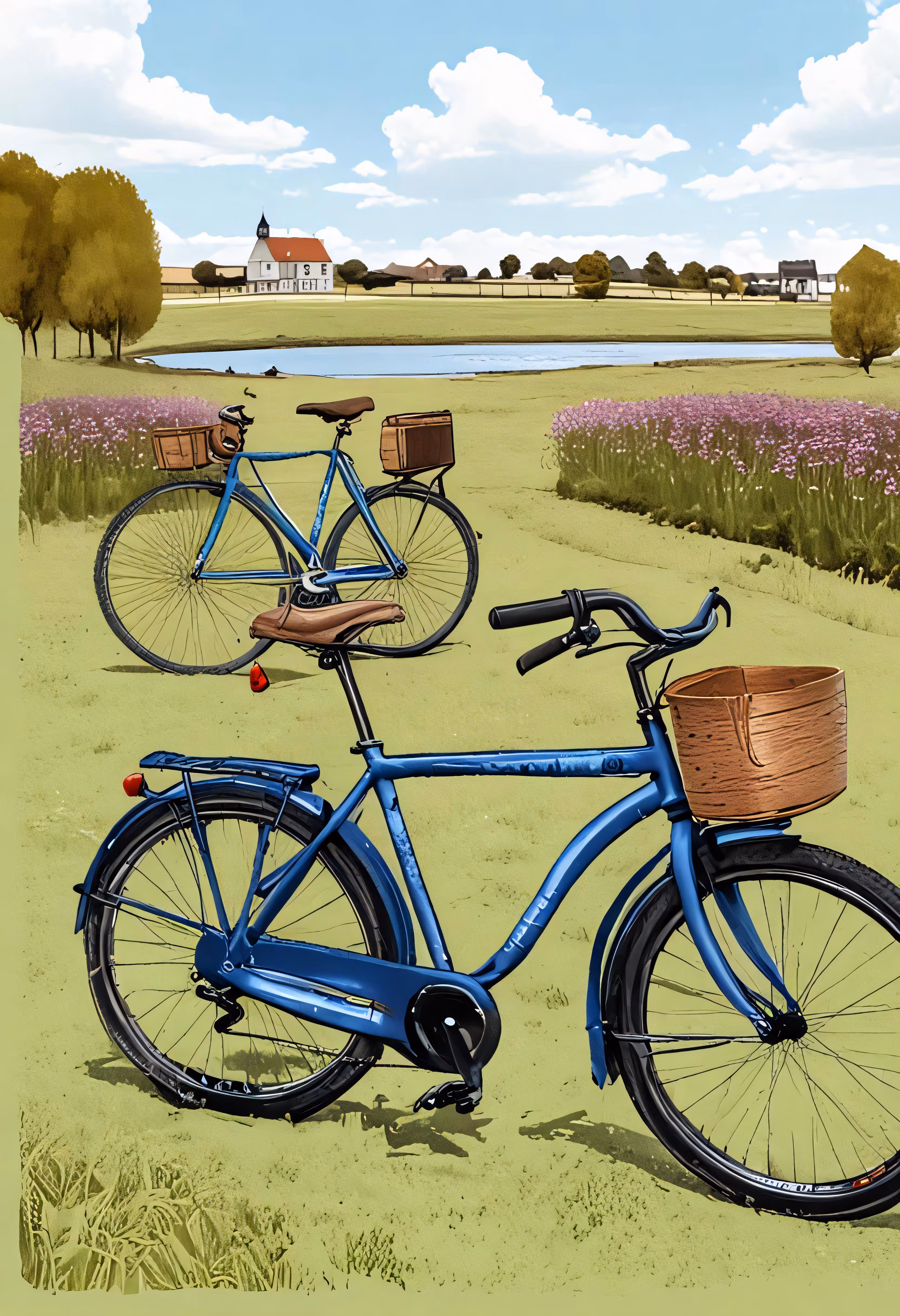 High resolution picture, free to use, a painting of a blue bike parked near a lake