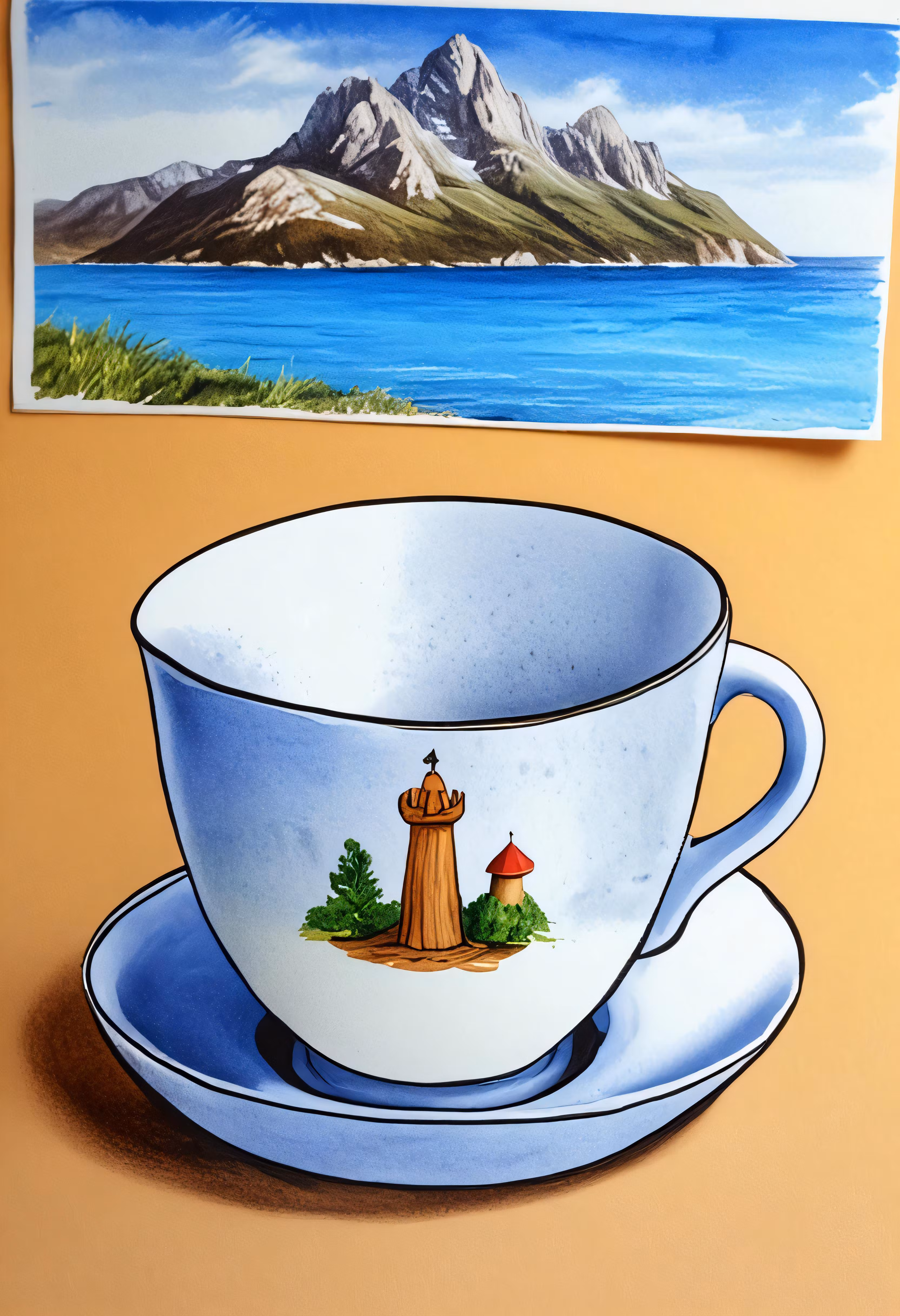 High resolution picture, free to use, a painting of a cup with the sea in the background