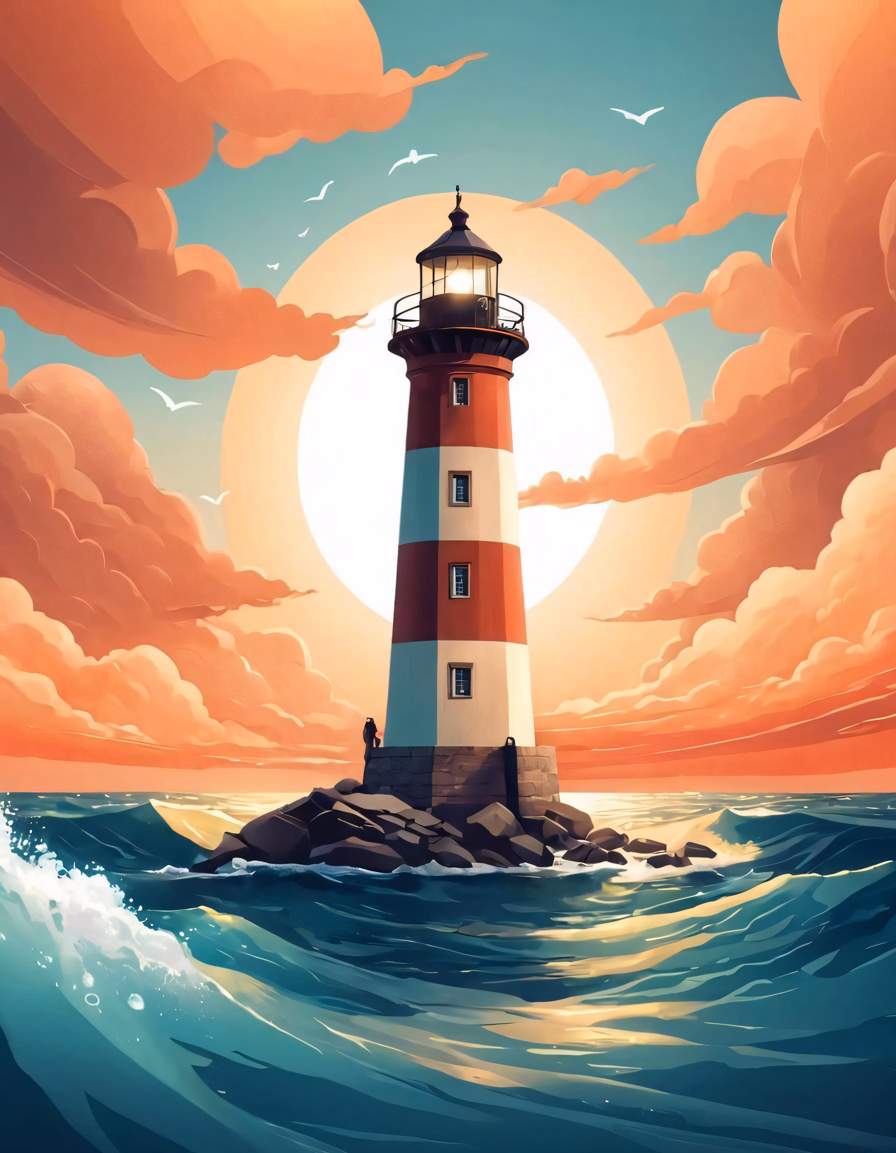High resolution picture, free to use, a painting of a lighthouse in a sea under a sunset