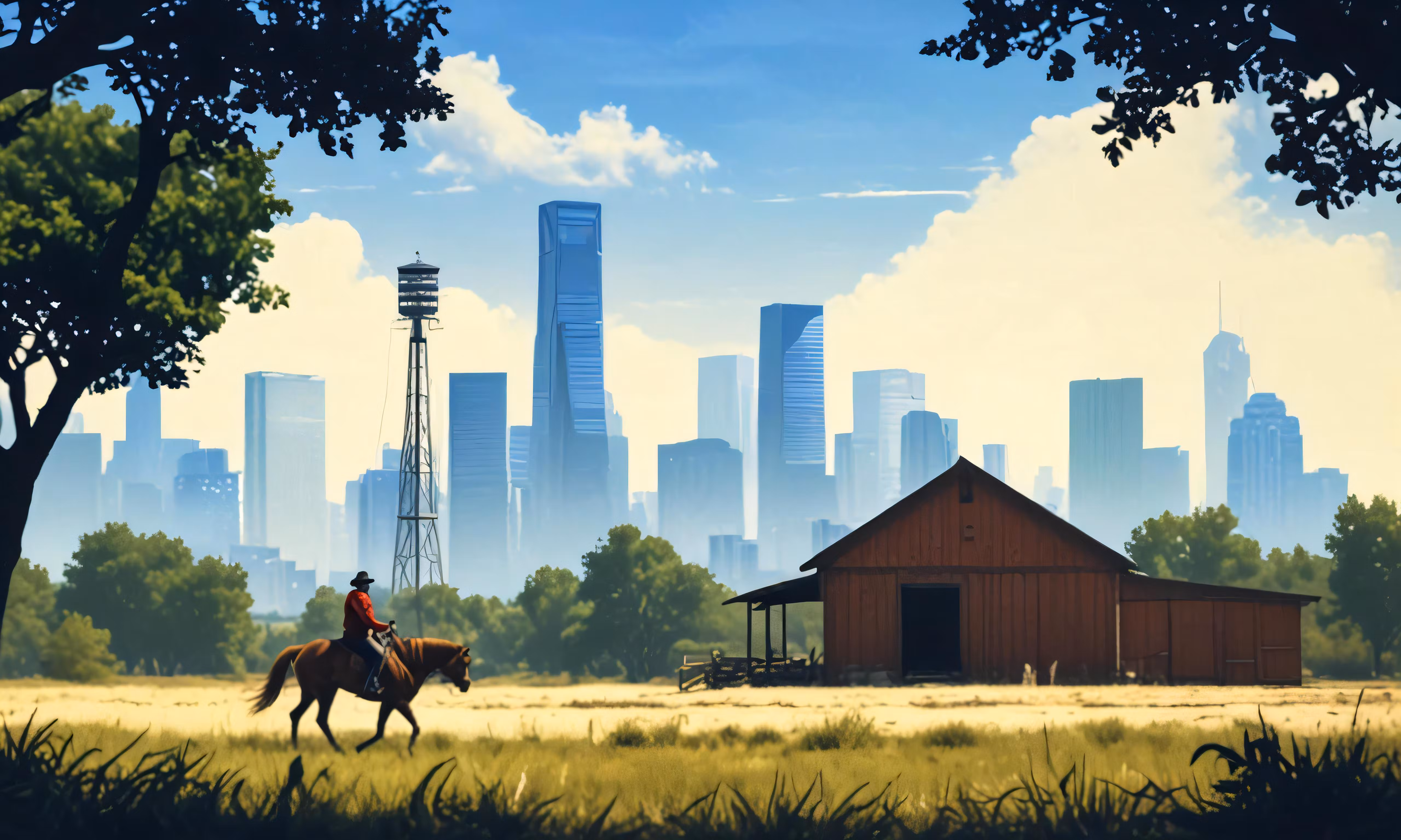 High resolution picture, free to use, a painting of a man on horseback in the foreground of a city skyline