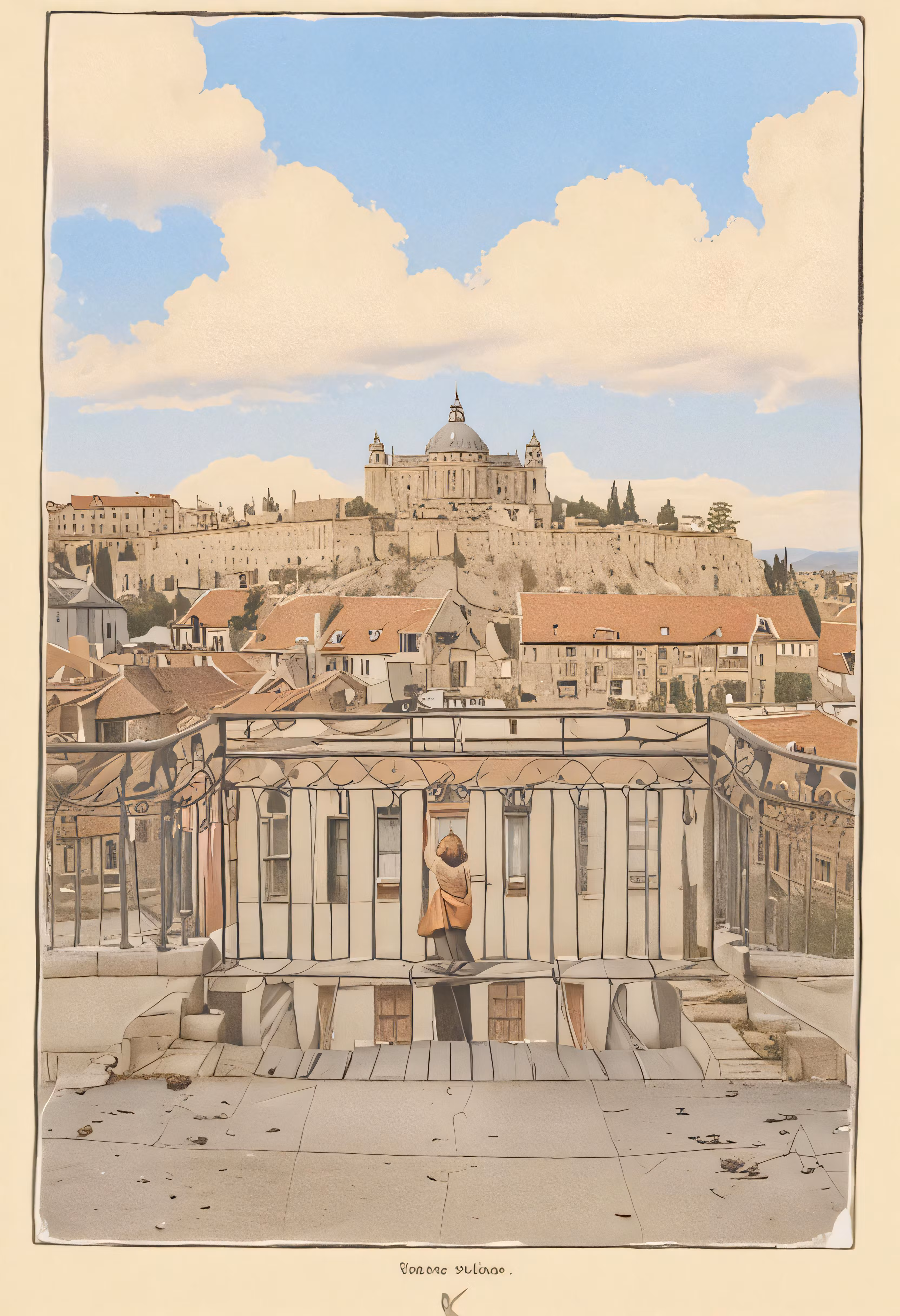 High resolution picture, free to use, a painting of a man sitting on the roof of a building