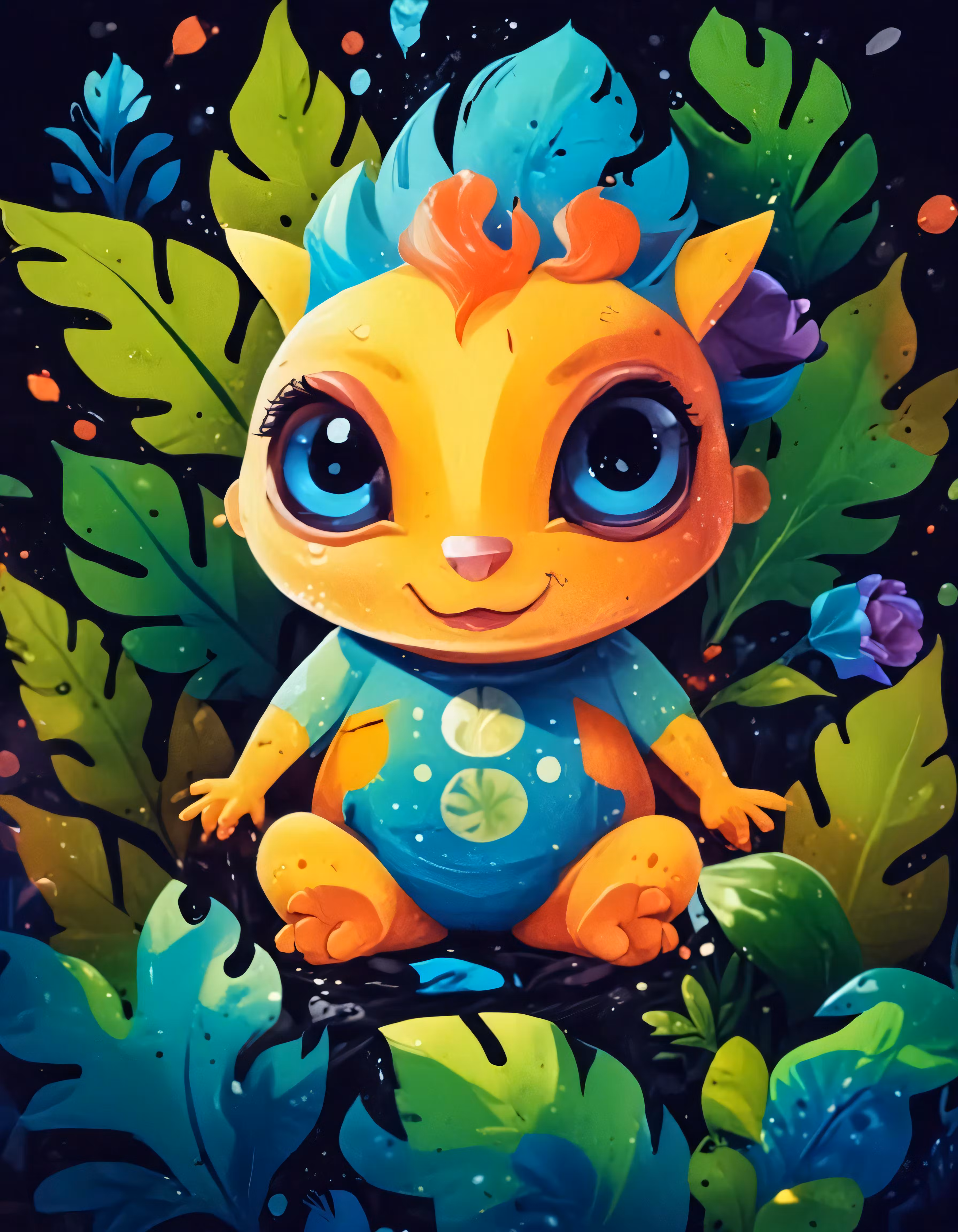 High resolution picture, free to use, a painting of a small yellow cat sitting in a pile of leaves