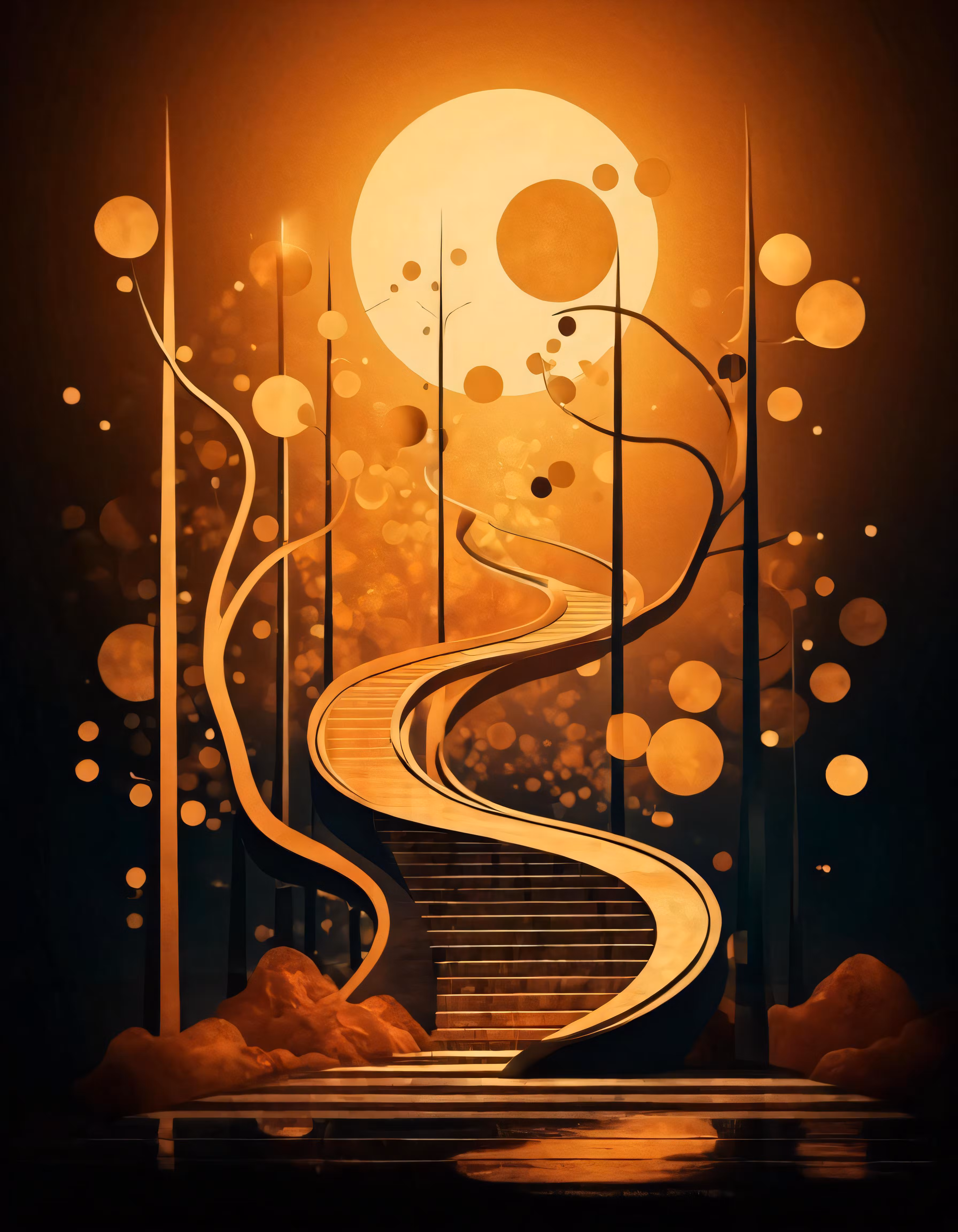 High resolution picture, free to use, a painting of a winding road with lights at the end