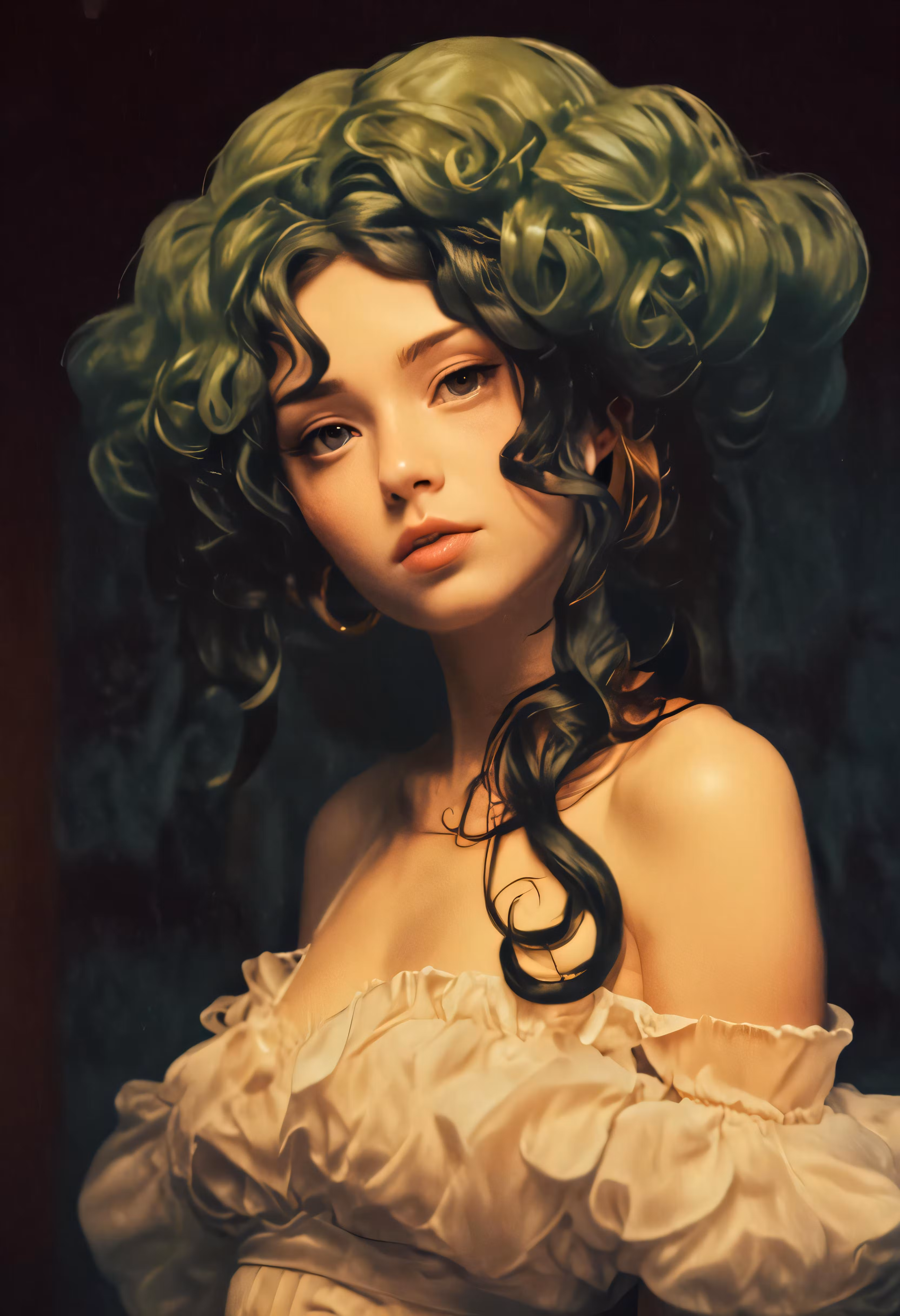 High resolution picture, free to use, a painting of a woman with green curly hair