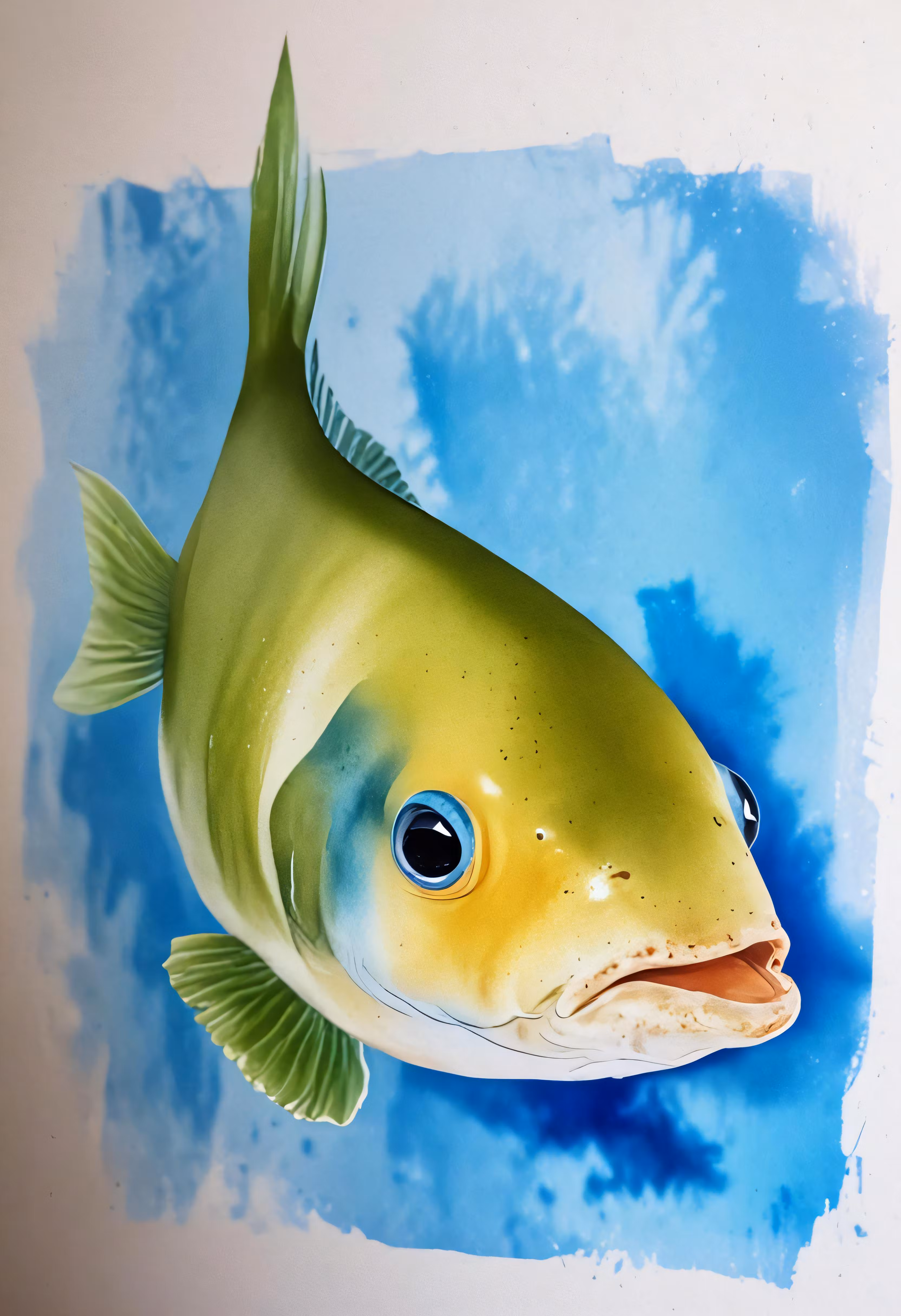 High resolution picture, free to use, a painting of a yellow fish on a white wall