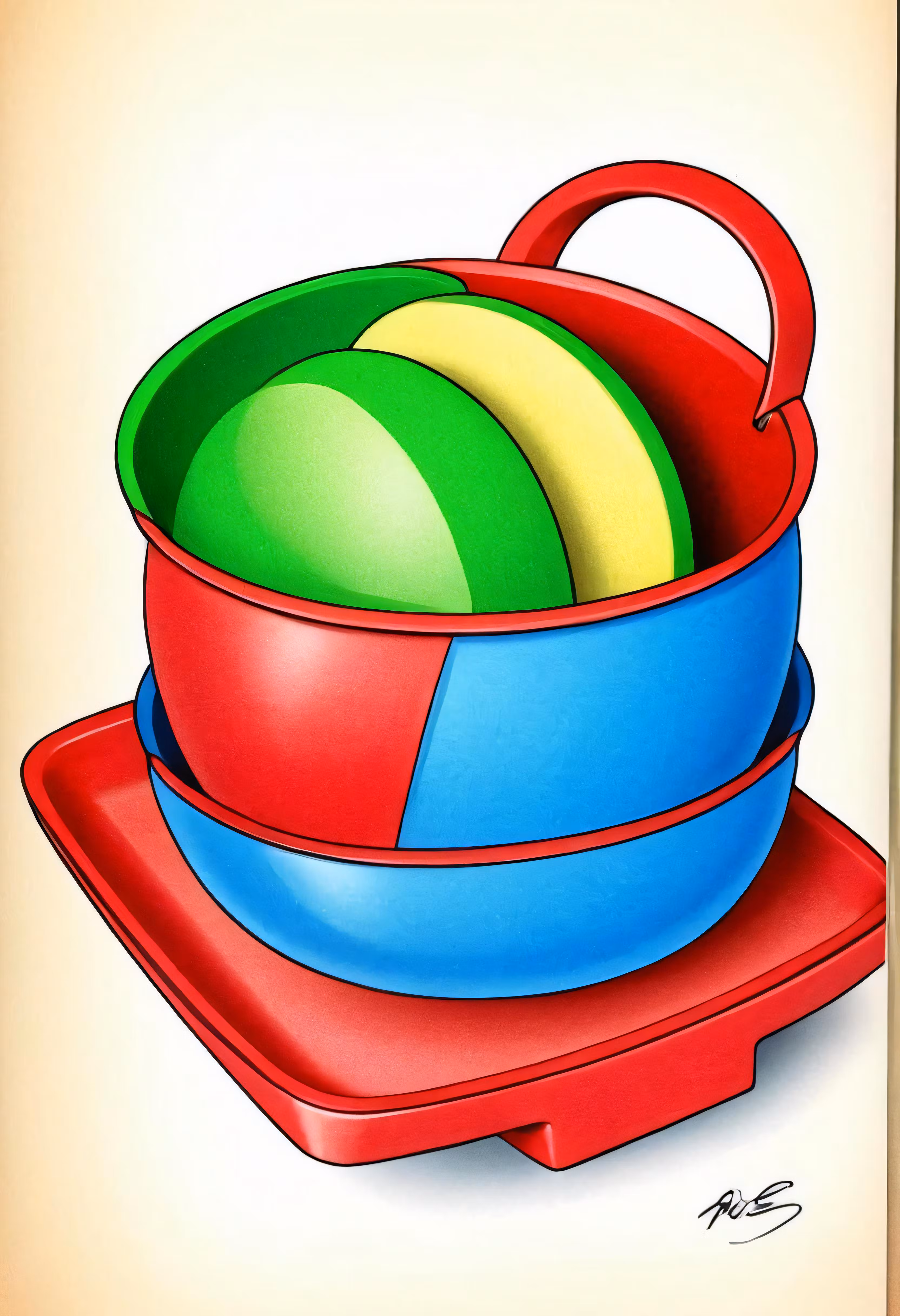 High resolution picture, free to use, a painting of some plastic bowls on top of a plate