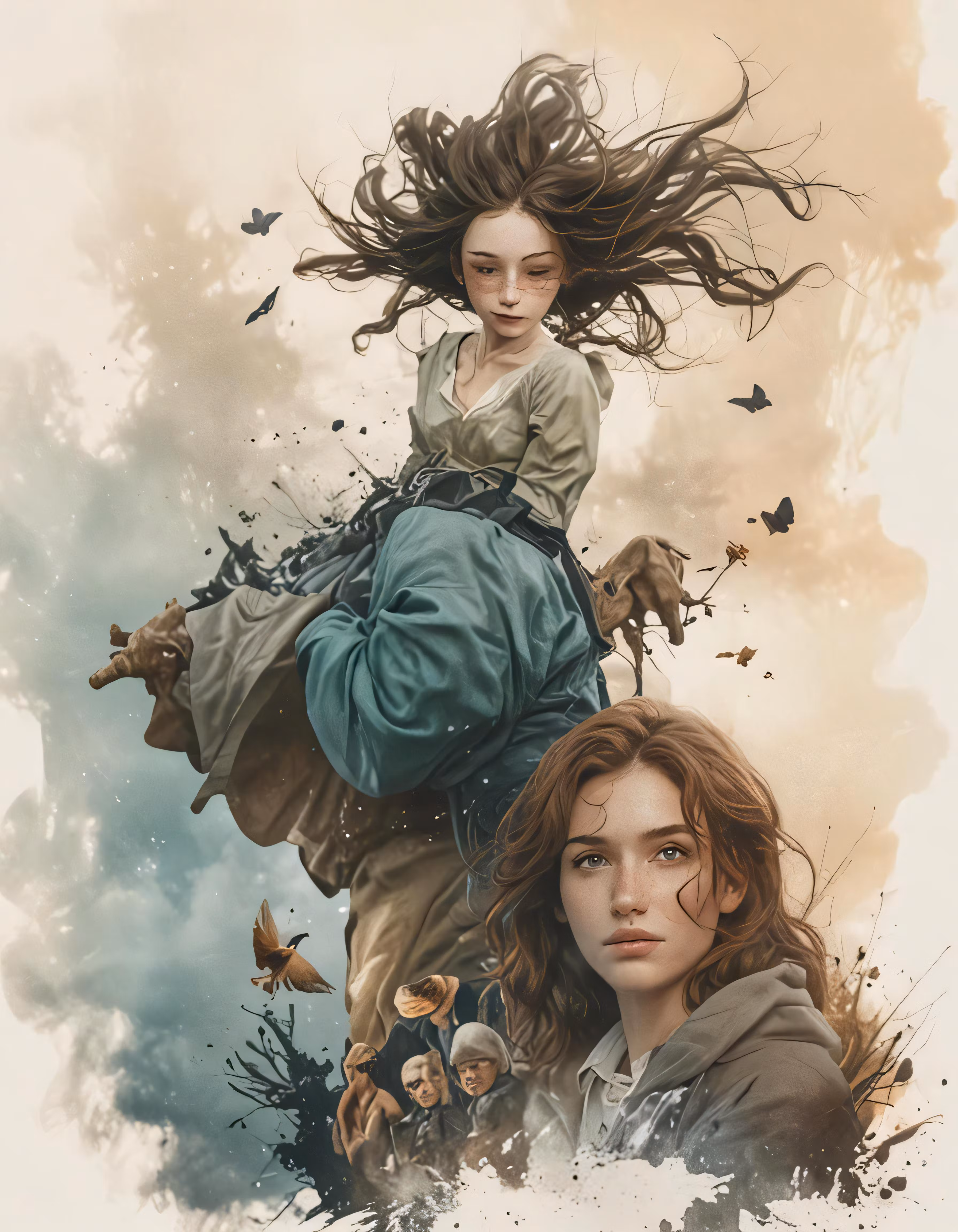 High resolution picture, free to use, a painting of two people in front of a sky with birds and clouds