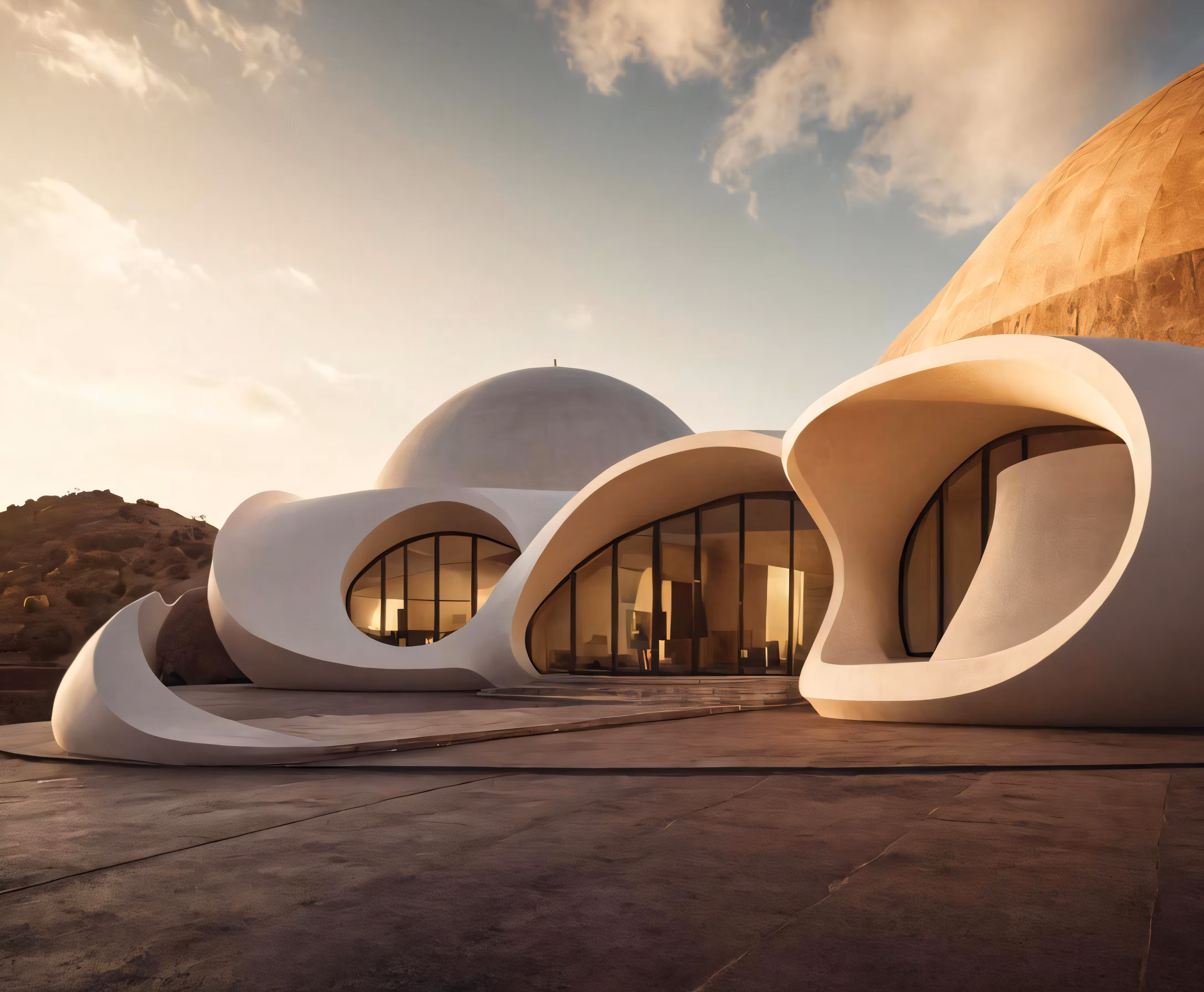 High resolution picture, free to use, a pair of large white domes sit in front of an adobe   like building