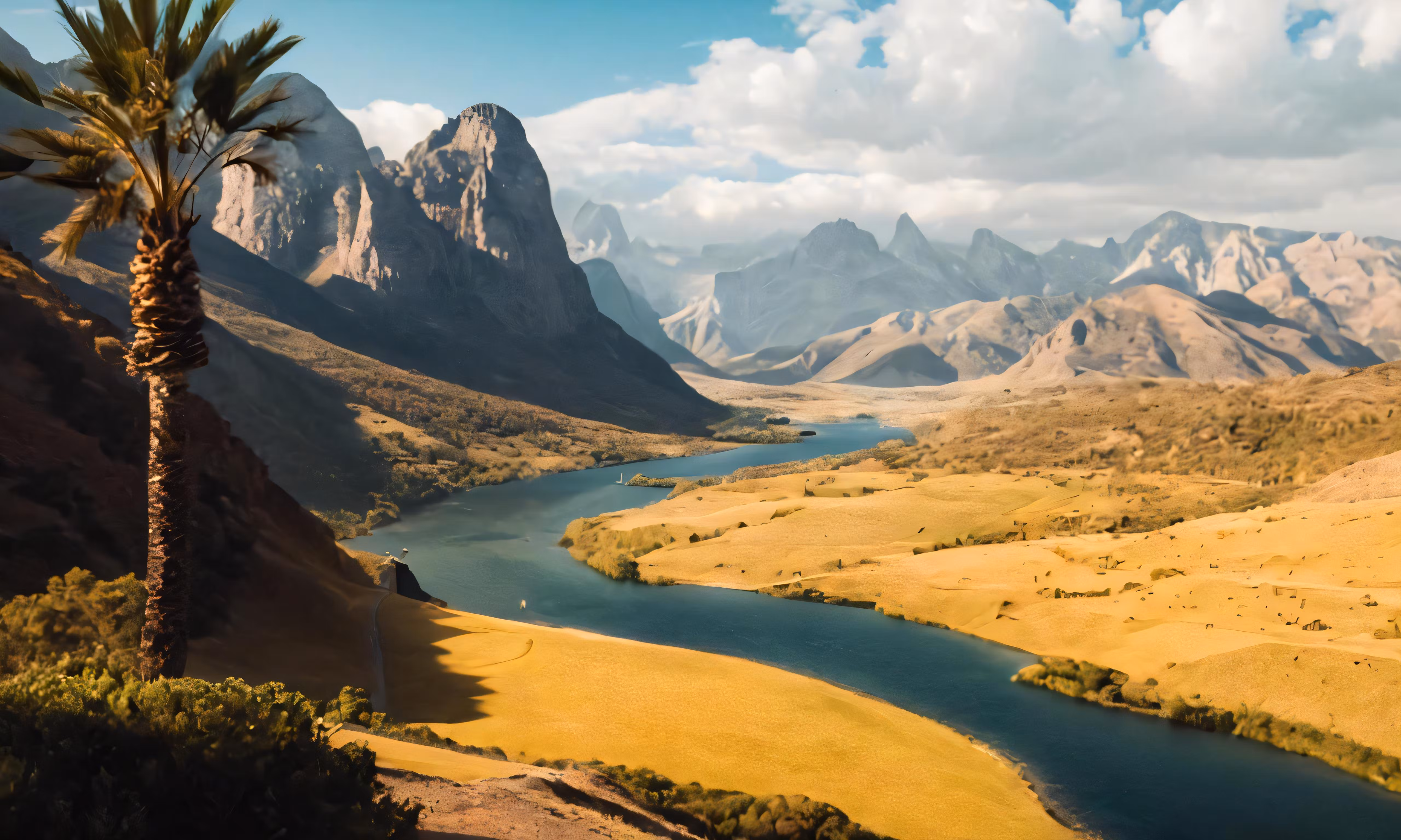 High resolution picture, free to use, a palm tree in the foreground overlooking a river in a valley